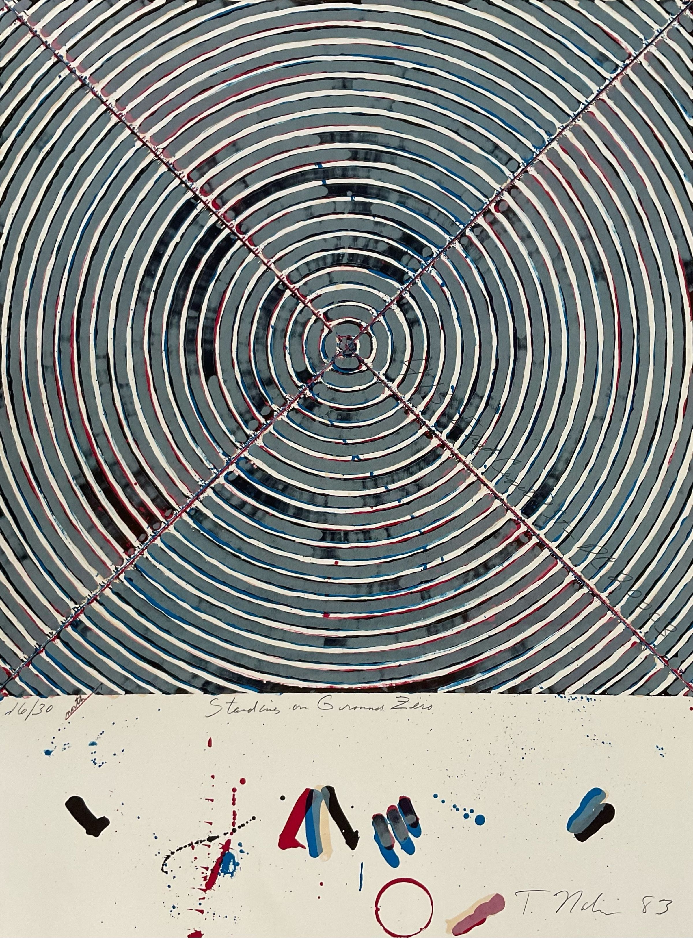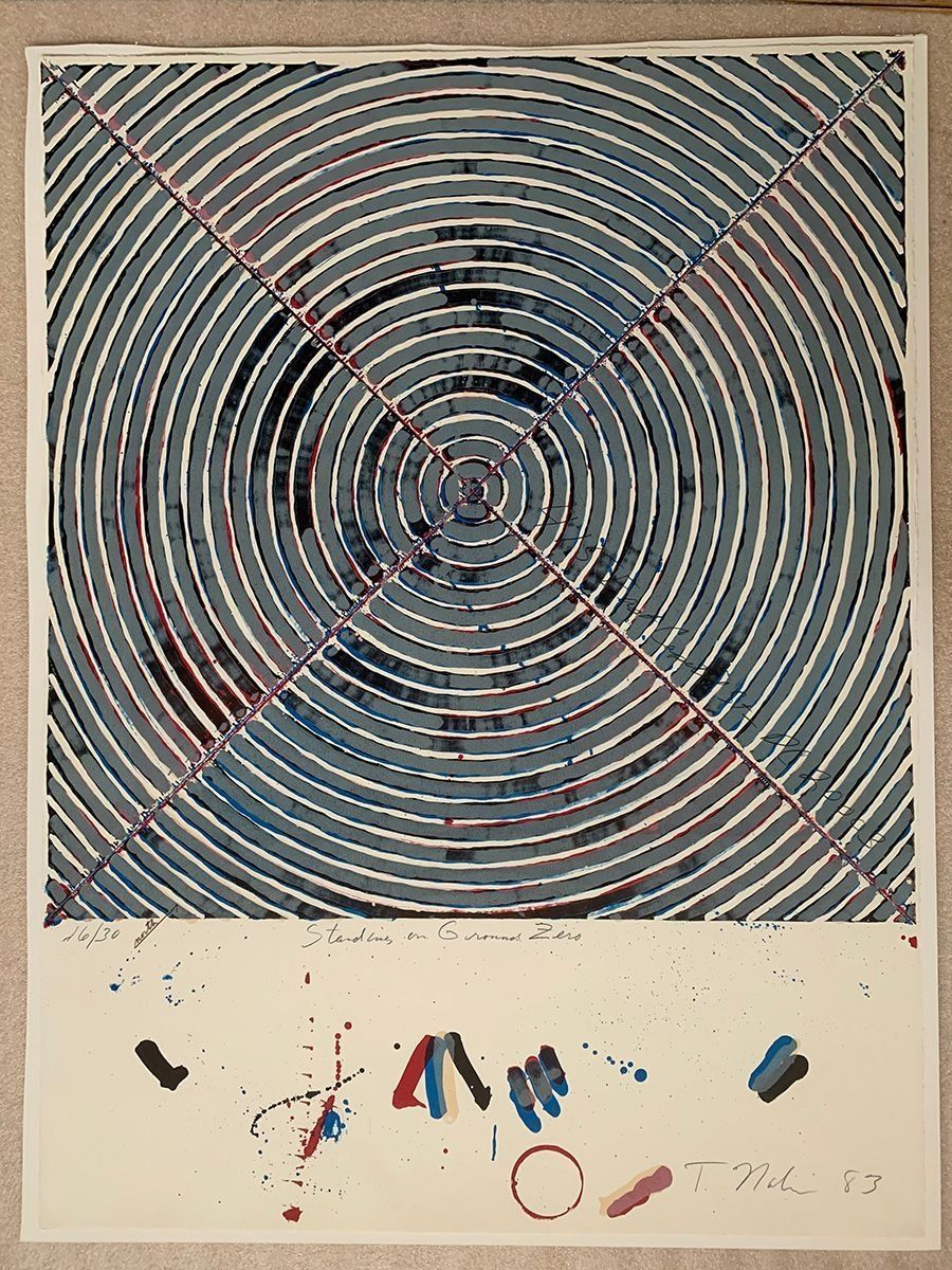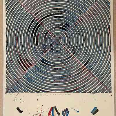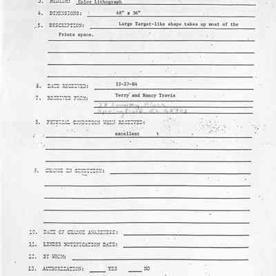 Large Target-like shape takes up most of the print space. Vertical, non-objective. Browns, tans, yellow-browns greens, flesh-tones, and grays create this non-objective piece. Silver metal frame with white and tan liners.Collection