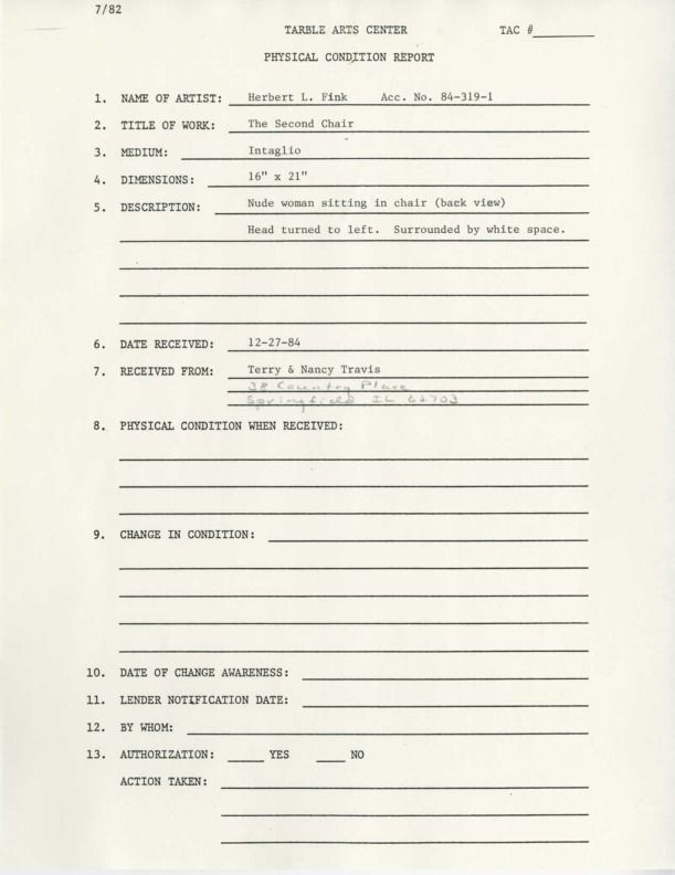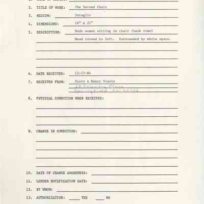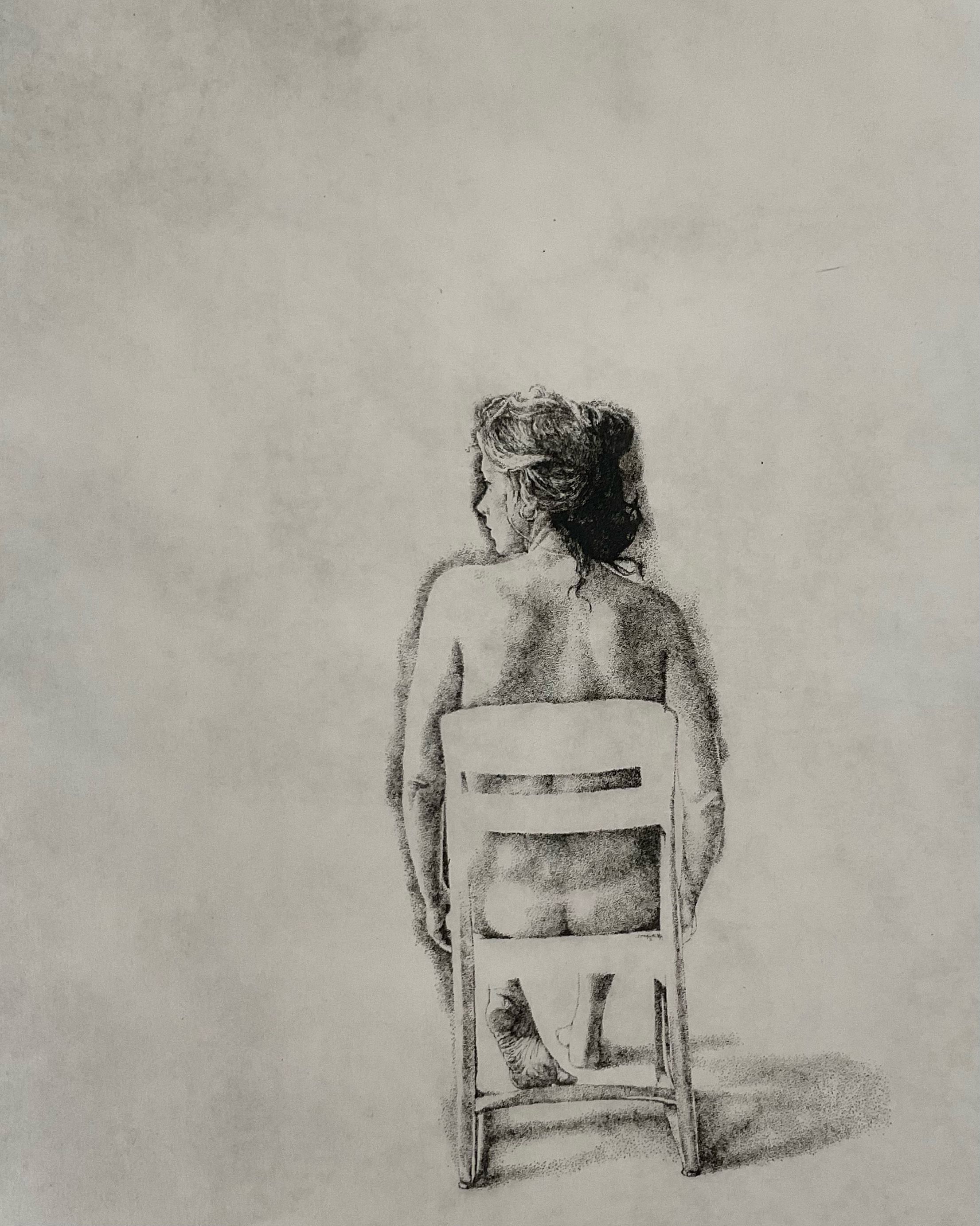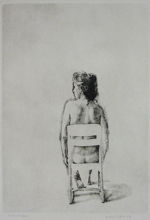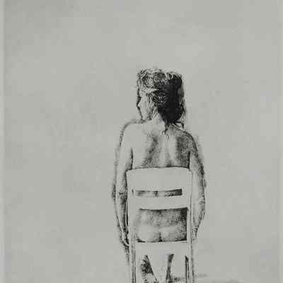 Black & white. Nude woman, back view, seated on straight-backed white chair with back to viewer looking left. Tones are made up of dots. Looks influenced by photography.Collection