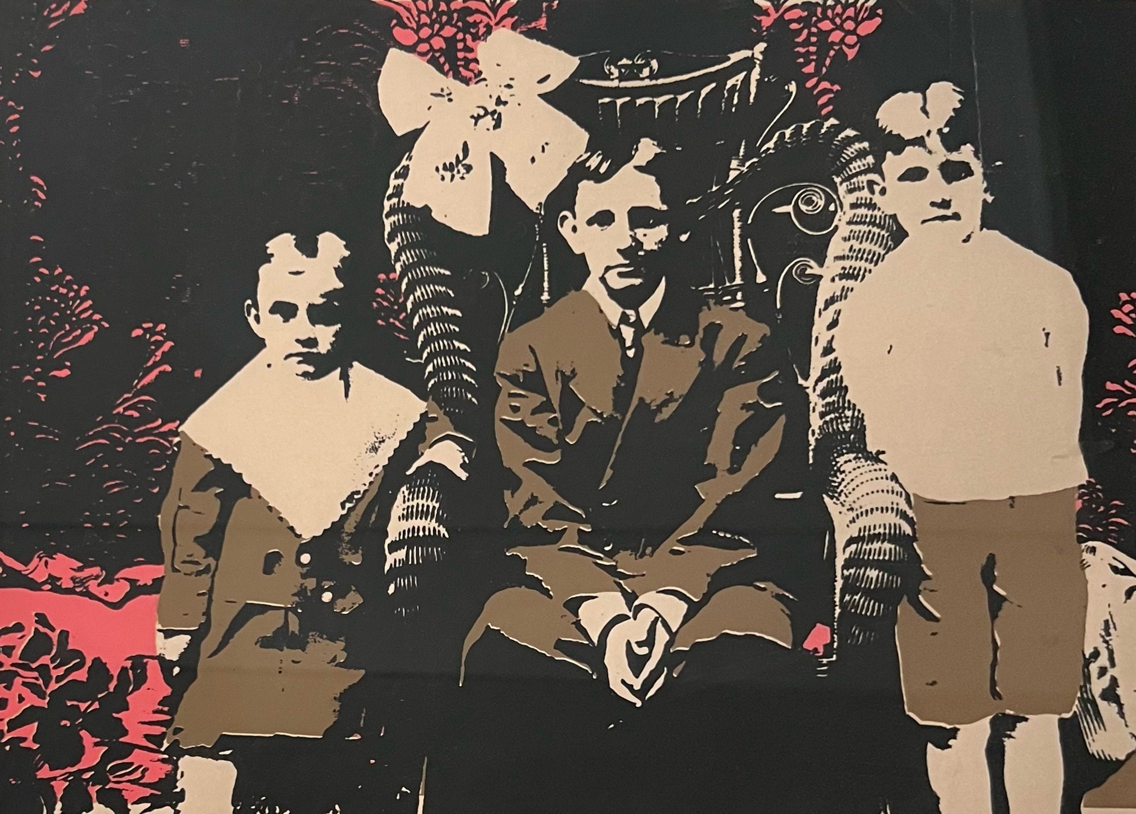 Three small boys, one sitting in middle in wicker chair, two standing on sides dressed in shorts, foliage in backyard old-fashioned looking. Done in black & light red inks in beige paper, cream mat, bronze metal frame, glass covering.Dimensions