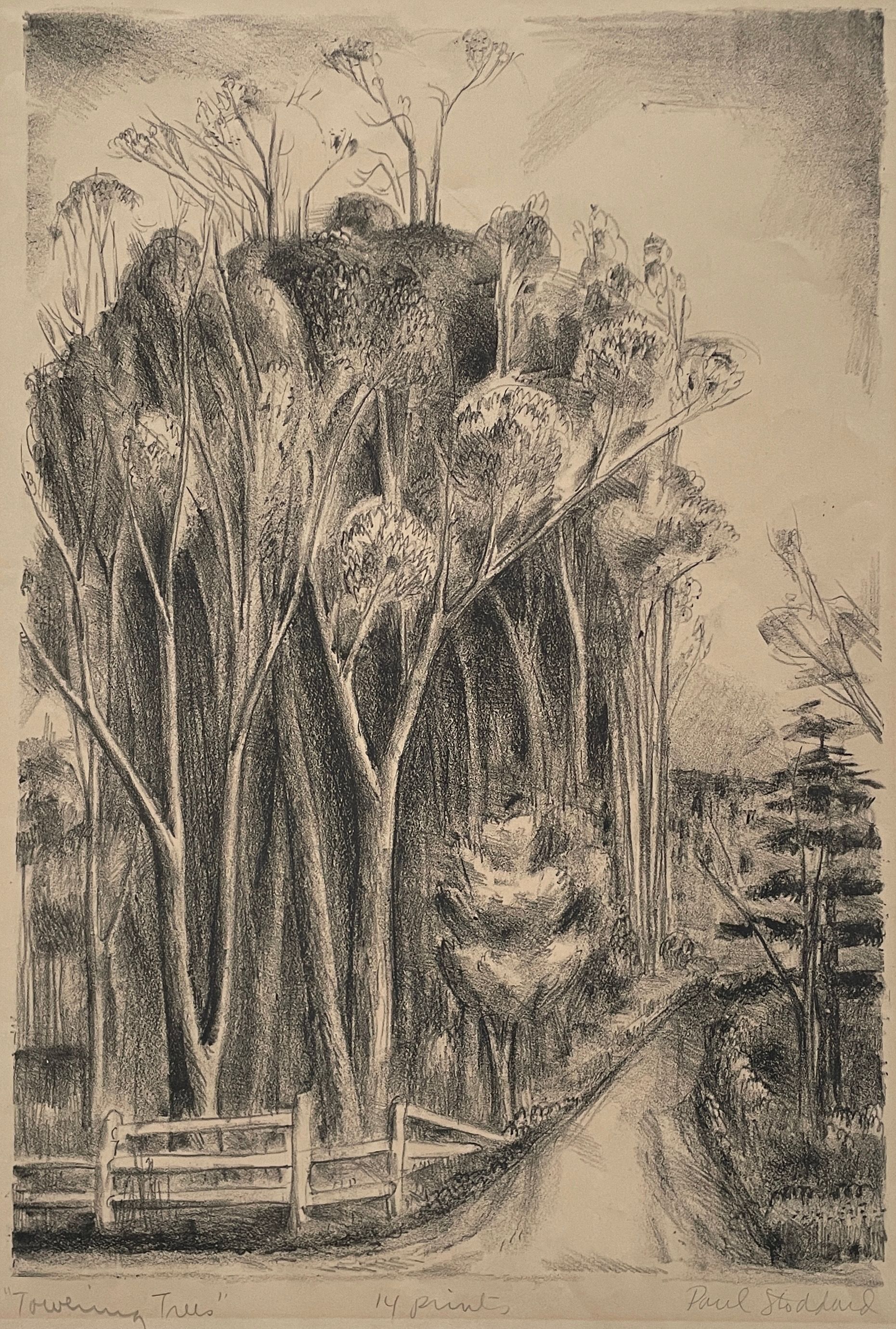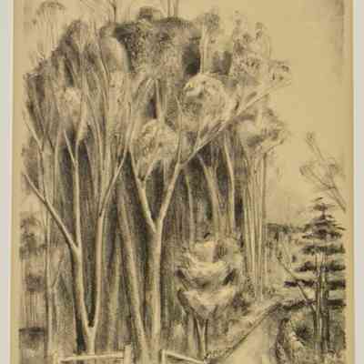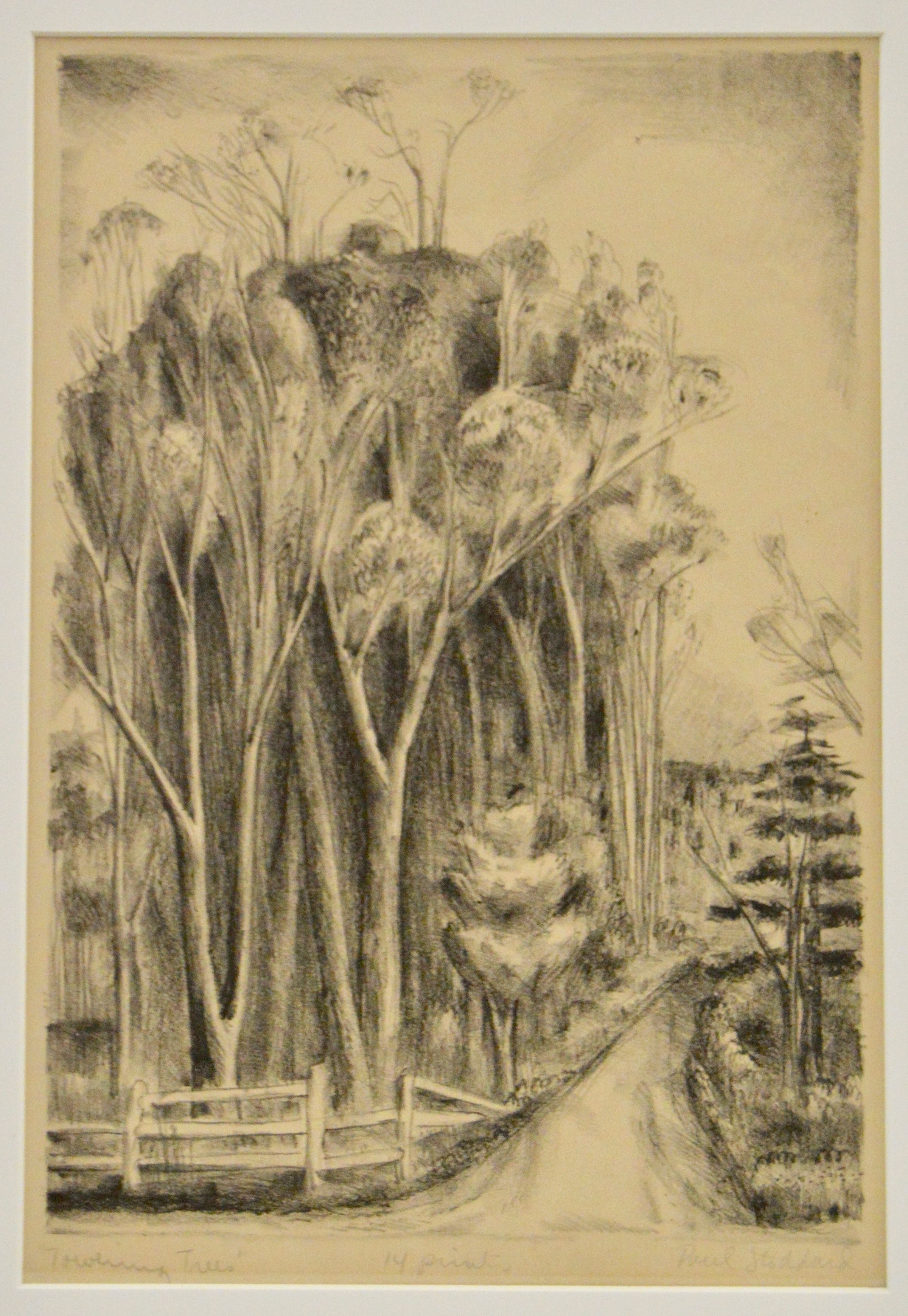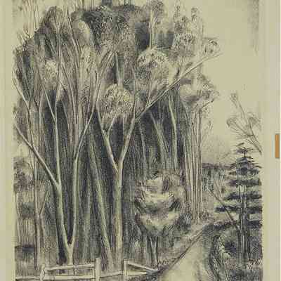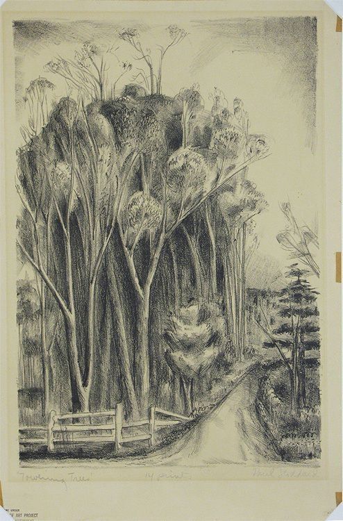 A road going between trees. Stamped: Done Under Public Works of Art Project.Collection