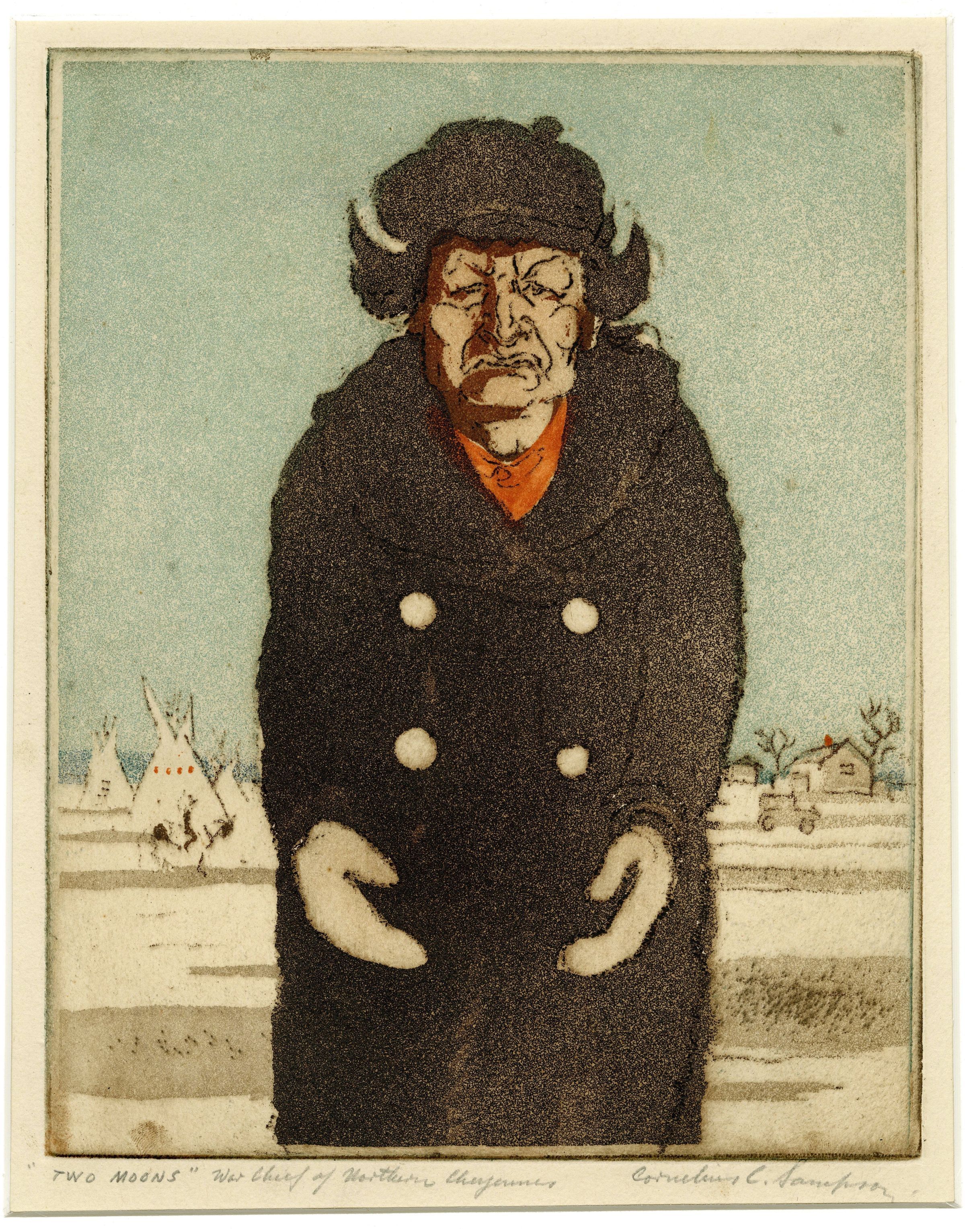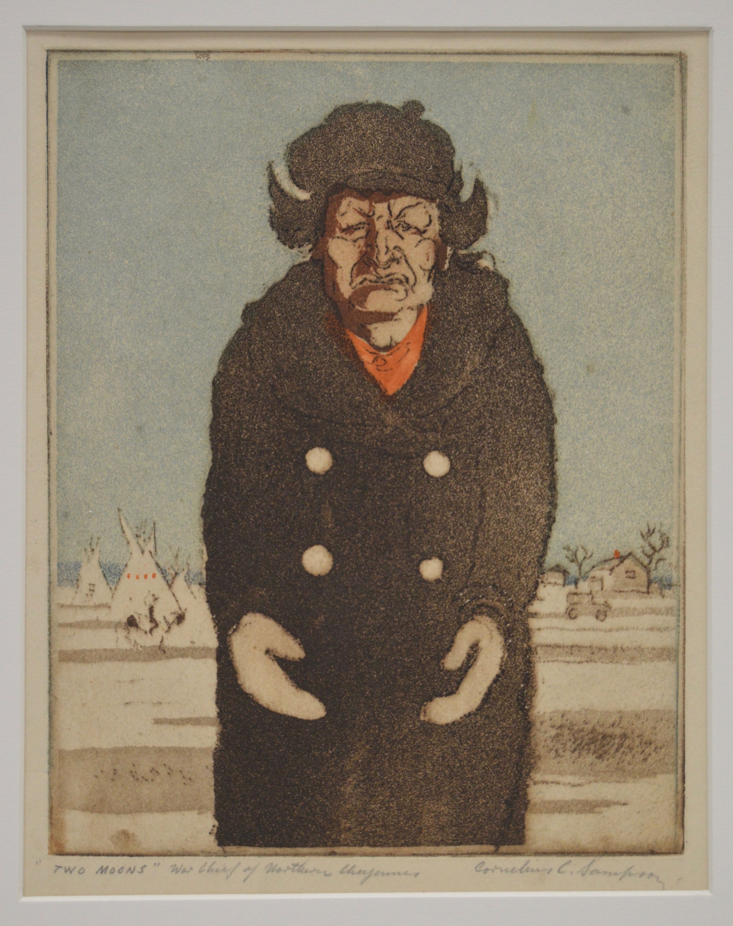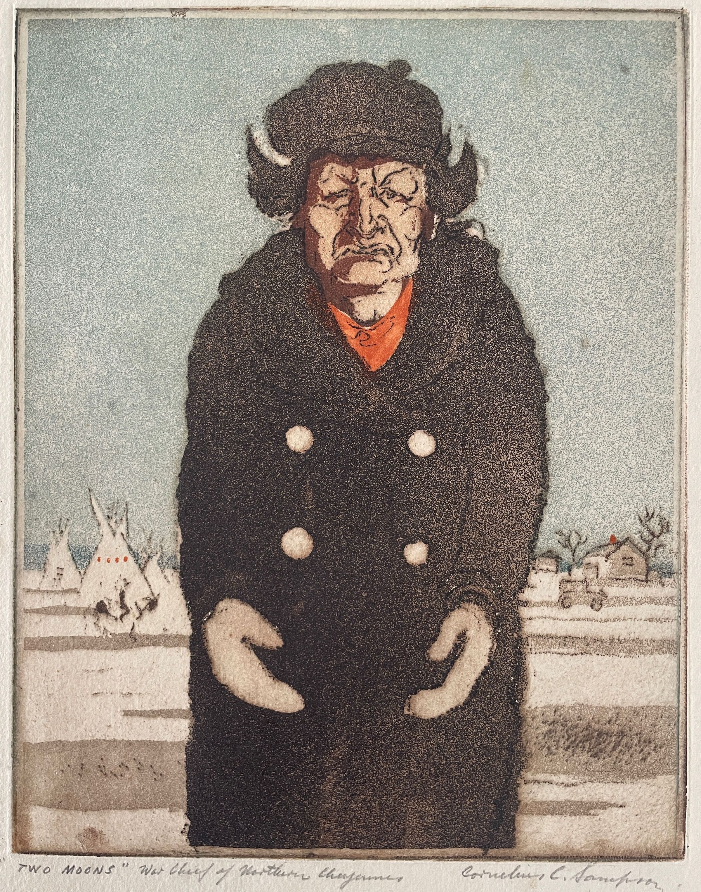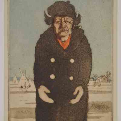 Man in heavy coat with mittens figure is stiff. Teepee and houses in background. Blue sky, dark brown for figure and outlines. Red scarf. Natural paper, Bronze toned meal frame. Stamped:Done Under Public Works of Art Project.Collection