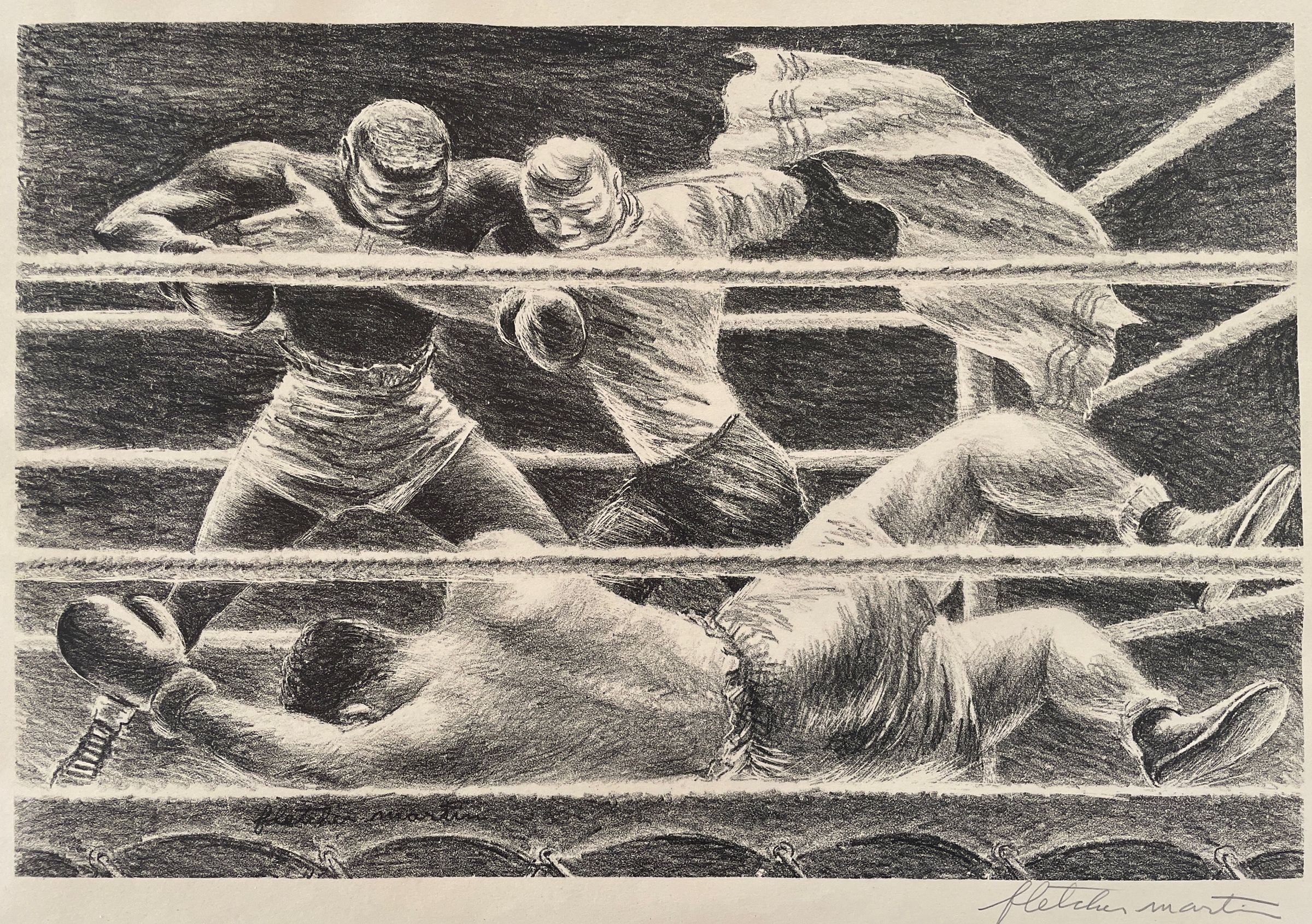 Boxing match-one fighter down-the referee is holding the other back. Towel in the air.Collection
