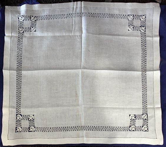Card table cover square. White linen hemstitched. Drawn work design is cross bars & dots with 4 moon & stars in each of 4 corners. Each corner has small 3-3/4" x 3-3/4" open handwork square.Collection