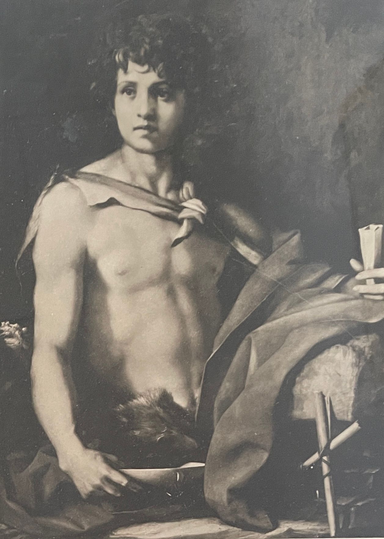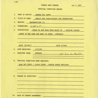 Torso of male body nude from waist up holding folded paper in one hand and bowl in other- portrait.Collection