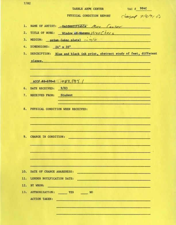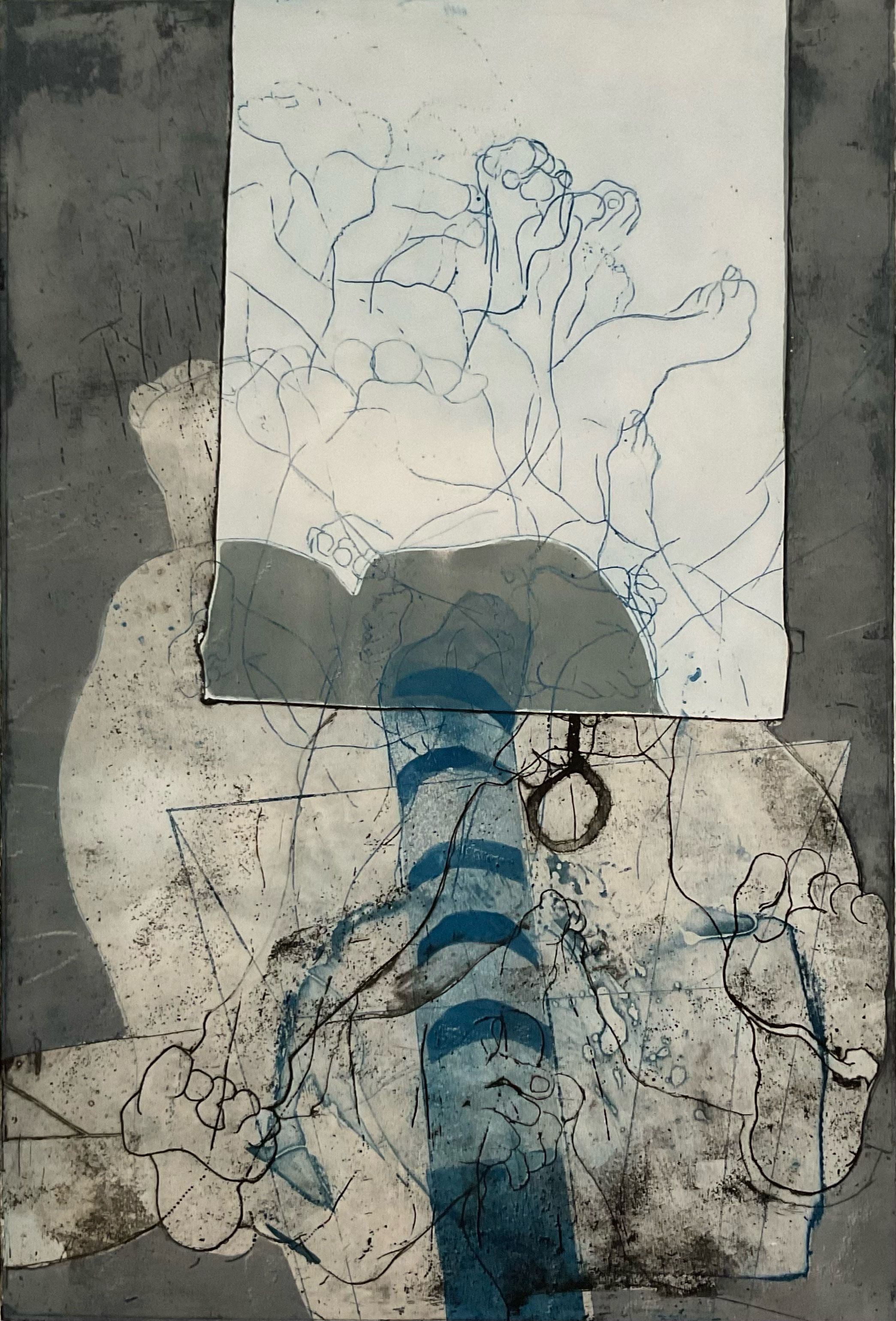 Blue and black ink print, abstract study of feet, different planes. Lower left "Window Watchers" lower middle "2/10" edition number lower right signed with a squiggly line and "69" after.Collection