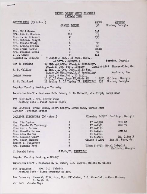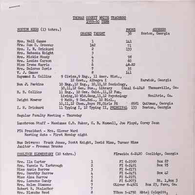This four page piece details the faculty and staff employed at Boston High, Coolidge Elementary, Meigs High, Ochlochnee Elementary, Pavo High, Central High, and other Thomas County School Personnel. Personal information for faculty and staff is included, such as title, classes taught, phone number, address, etc.Cataloged By