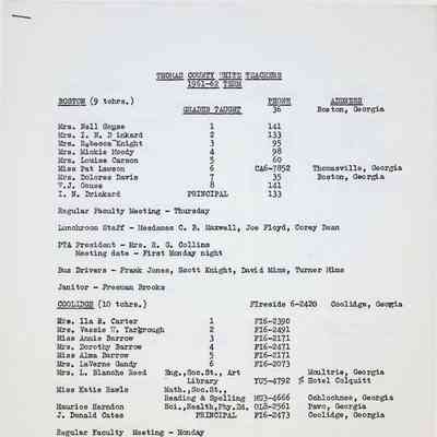 This booklet details the teachers and staff employed at Thomas County Schools, specifically the white schools. It provides personal inforamtion such as address and phone number for each employee.Collection