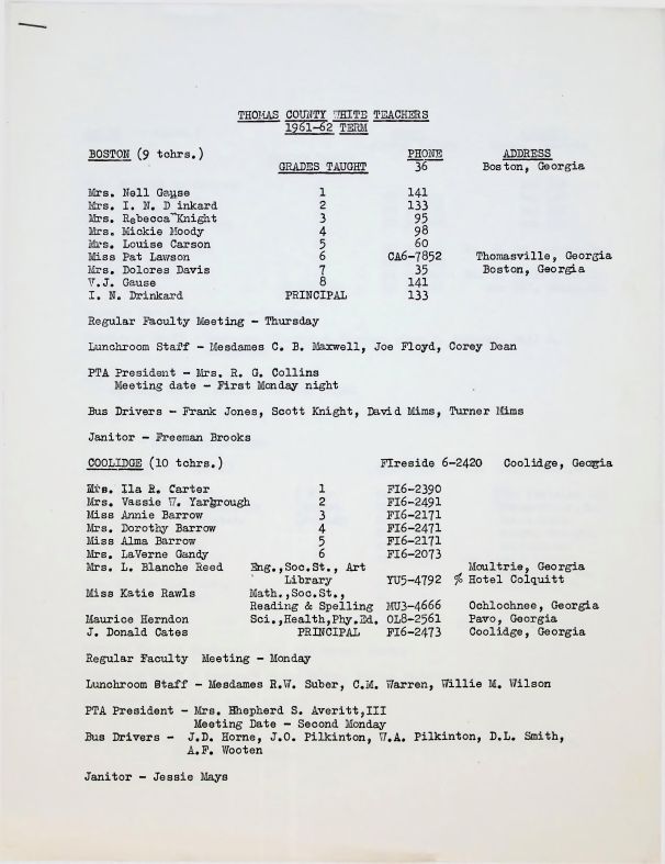 1961-1962, Thomas County Schools, Boston High, North Boston Elementary School, Coolidge Elementary, South Coolidge Elementary, Meigs High, Ochlocknee Elementary, Ochlocknee High School, Pavo Elementary, Pavo High, Central High SchoolDescription
