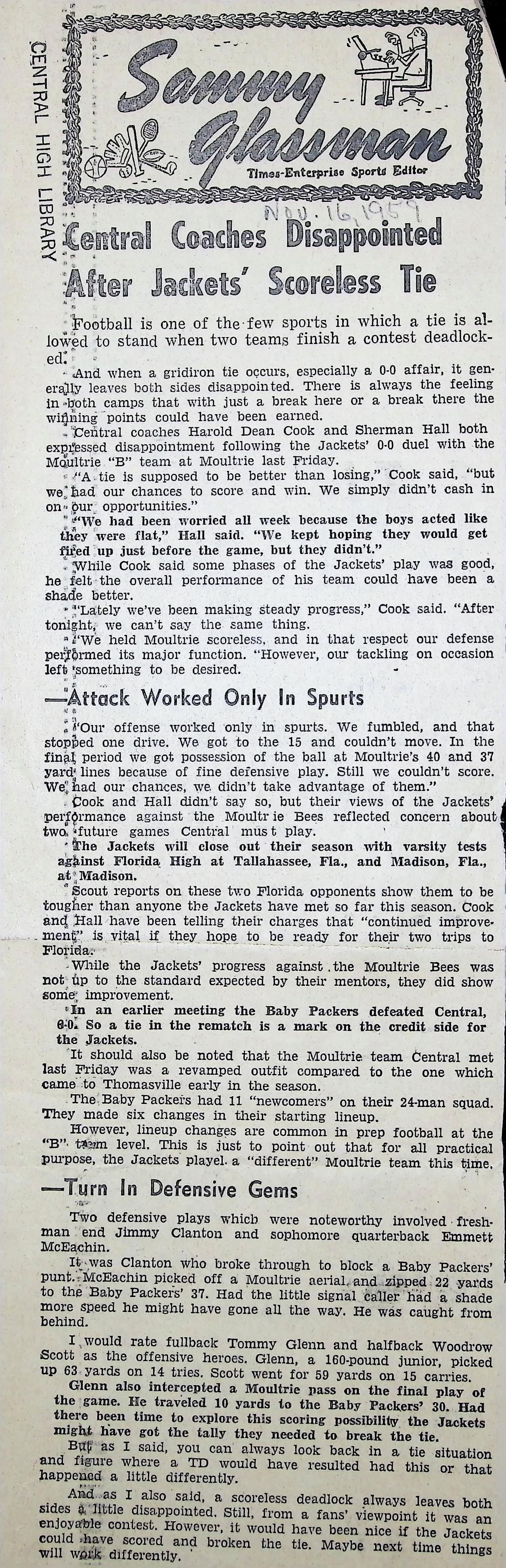 Newspaper Clipping "Central Coaches Disappointed After Jackets' Scoreless Tie"Tags