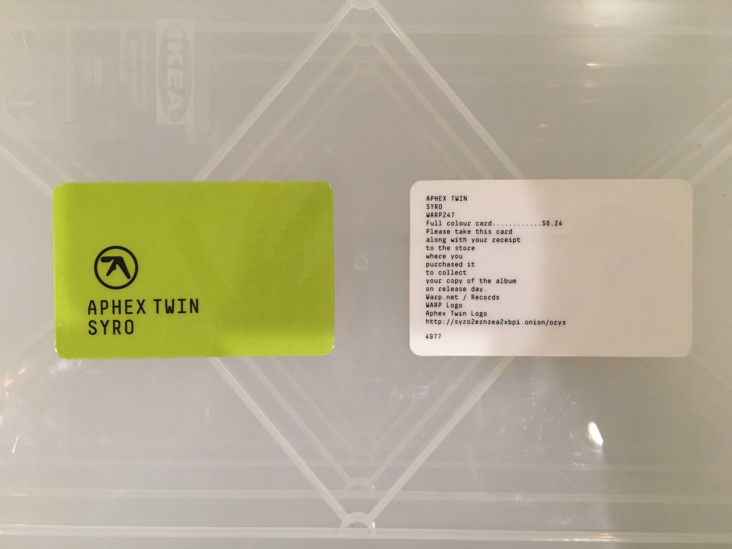 Promotional cards handed out around the release of Aphex Twin's 2014 album, Syro. When purchased, these cards served as vouchers for one physical copy of the album. They were part of a design system developed by TDR, or The Designer's Republic, for the release of the album. They associate with the album cover itself, as well as the mysterious Aphex Twin blimp which flew over the UK for several weeks anticipating the album release. I found the designs interesting for their use of very digital and un-organic color, as well as their tremendously beautiful monospaced typography.Made/Created