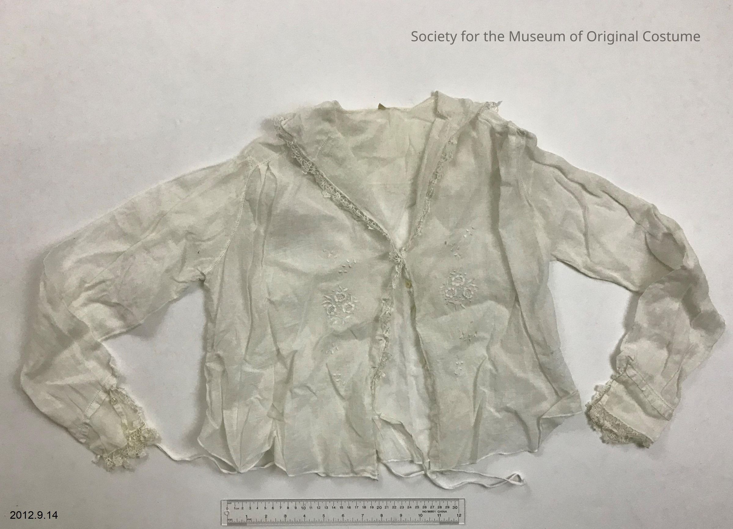 Woman's blouse with sailor collar. Centre front opening with five mother of pearl buttons. Collar edged with machine made floral lace. Similar lace and buttons on cuffs. Size tag sewn into back of neck marked 38.Acquisition