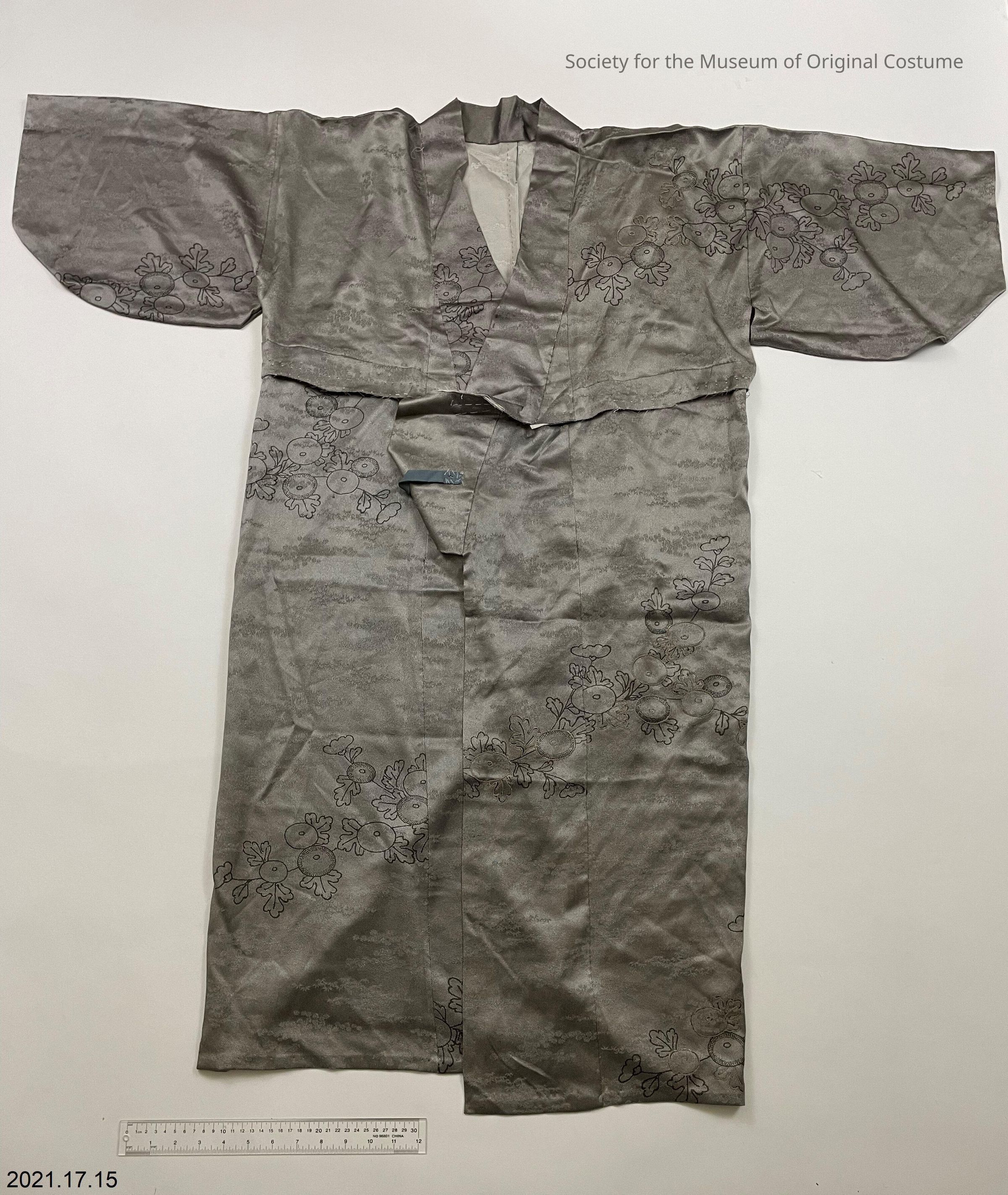 Silver grey damask silk haori with dotted and floral print and metallic floral embroidery. The collar runs around the neck and down to about rib-height. Sleeves end above the elbows. The miyatsukuchi (the lower half of the armholes that are not covered by the sleeves) suggest this garment is made to be worn by a woman. A rectangular section of fabric is attached at both the left and right front opening. To each rectangular section is attached a length of taupe floral silk haori hime. Haori has many unhemmed and lightly fraying seams on both the inside and outside. Seams fortified with temporary white shitsuke ito stitching overall.