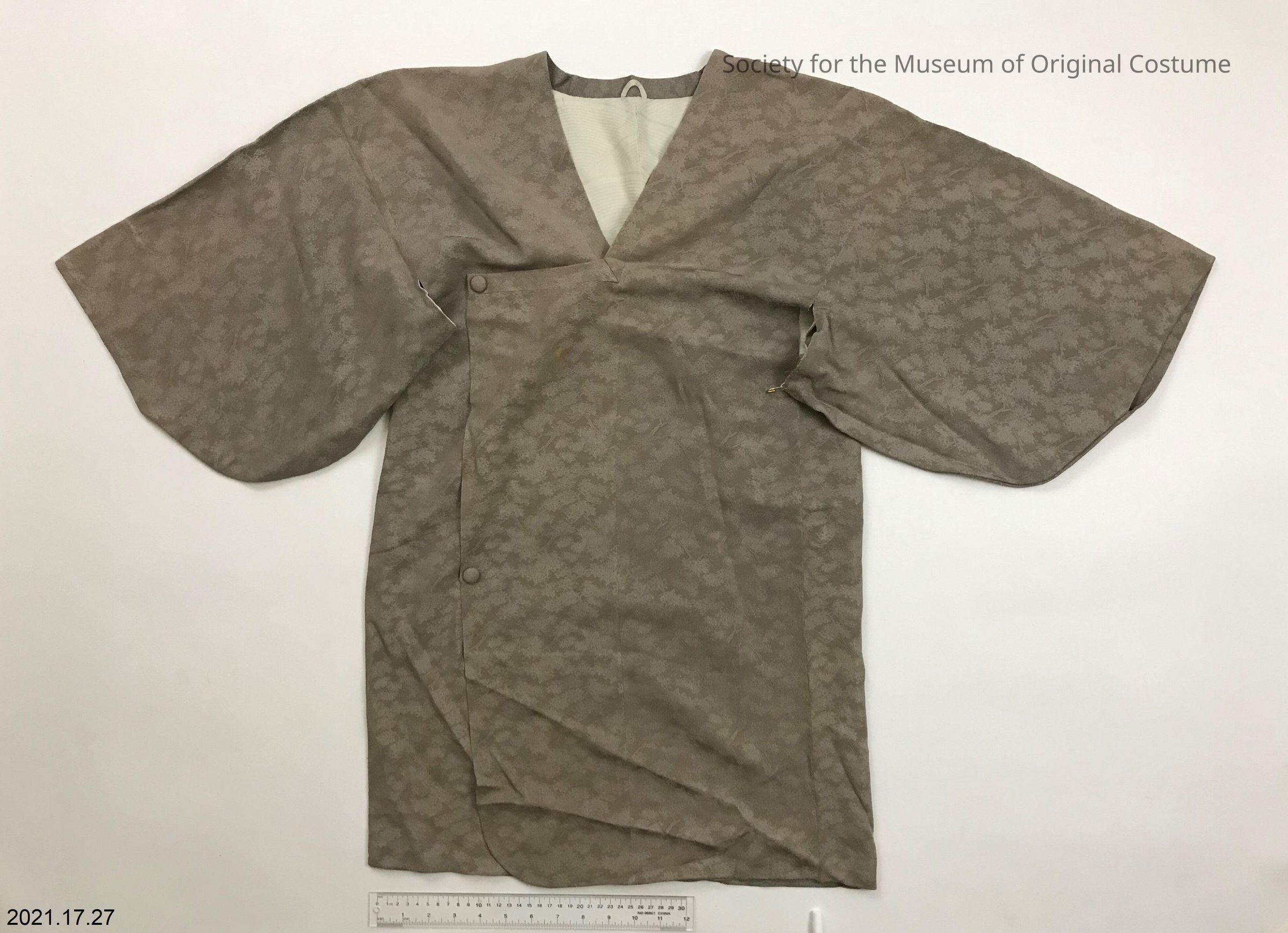 Taupe silk damask haori. About hip-length. Damask pattern appears to depict twisted tree branches in a similar taupe colour. No collar. The sleeves are broad and rectangular, with a rounded end and broad wrist openings that are about 3/4 as broad as the sleeves themselves. Haori has a miyatsukuchi (i.e. the lower half of the armholes that are not covered by the sleeves) suggesting it is made to be worn by a woman. This haori is single-breasted. The front panels overlap, left over right, and fasten in place with three snap fasteners. Three decorative self-covered buttons on edge of left front panel. Rectangular cream silk panel at inside shoulders. Inside the haori are two short cords (haori himo) made of same cream silk as panel, one each at the left and the right side seam. Some small yellow stains on outside front.Acquisition