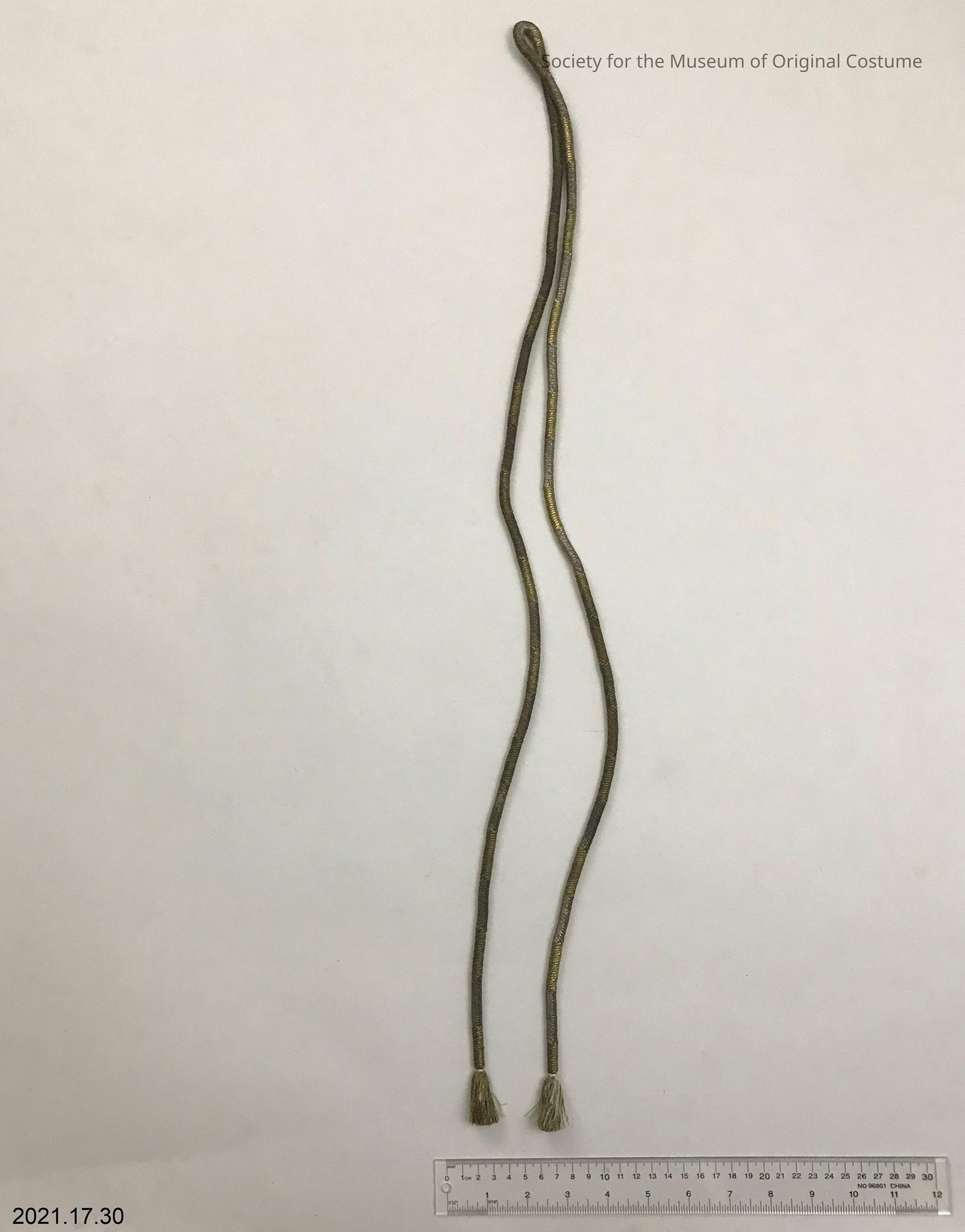 Gold and silver metallic round braided cord. Metallic thread is braided around ivory silk threads. Ends of obijime threads are bound into short tassels.Acquisition