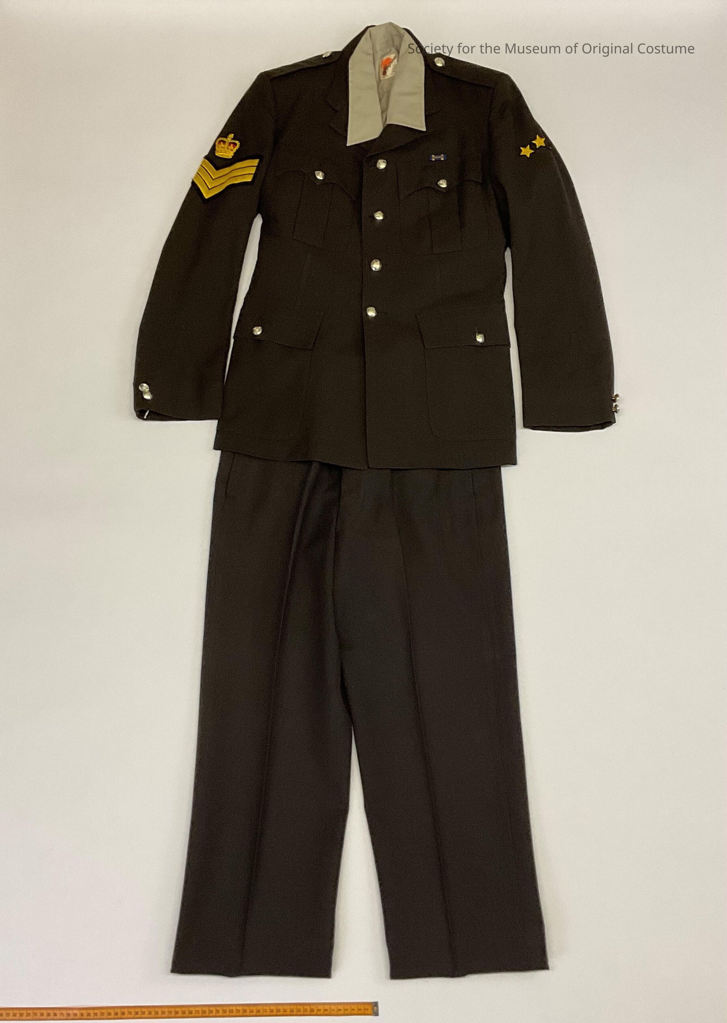 Part C) Brown wool uniform trousers. Belt loops on waistband. Suspender buttons inside waistband. Button fly closure down center front. Seam pocket on left and right waist seam. Waistband and pockets made of beige cotton. Legs are straight and cuffed at bottom hem.