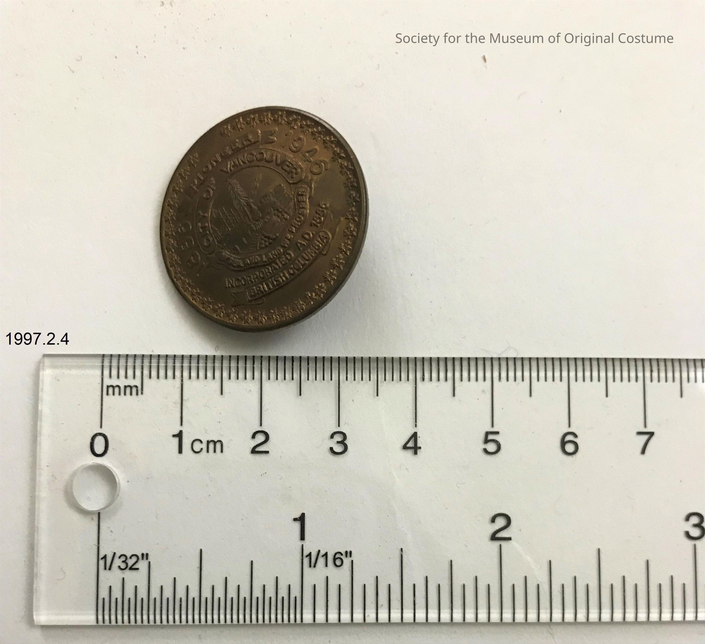 Round gold metallic pin. The center of the pin depicts a railroad scene, around which is the following text: "PIONEER / 1886 / 1946 / CITY OF VANCOUVER / BY SEA AND LAND WE PROSPER / INCORPORATED AD. 1886 / BRITISH COLUMBIA". Outside of pin is decorated with maple leaves.Acquisition