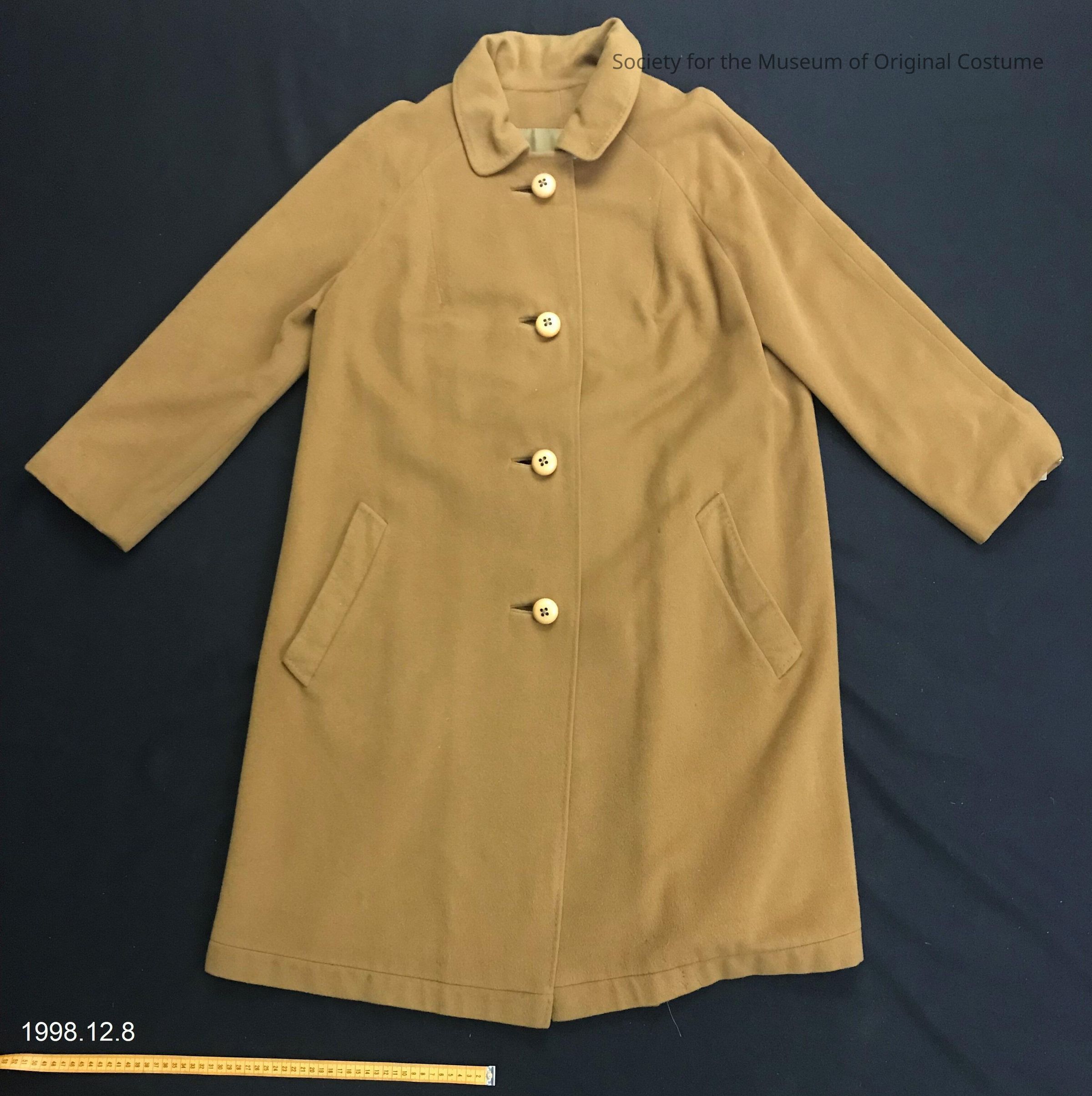 Brown alpaca cloth coat. Flat collar. Diagonal broad welt pocket on right and left front. Lined with brown synthetic fabric. Coat fastens in front with four tan plastic buttons as well as a grey button hidden under left collar. Small holes in exterior and lining.Use