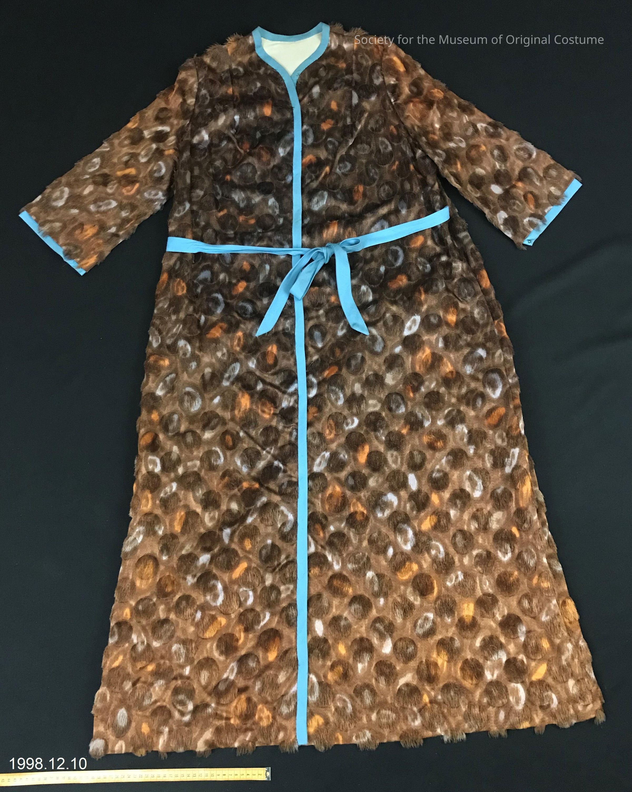 Part A) Brown and blue evening coat. Printed with circular "eyelash" velvet pattern in shades of brown. Three-quarter sleeves. A seam pocket on both right and left sides. Placket down entire front of coat covering snap fasteners, which also extend entire length of coat. Neckline, placket and sleeves edged with blue satin. Two small vertical slits in waist for belt to pass through. Lined with grey synthetic. Some staining on placket and lining.
