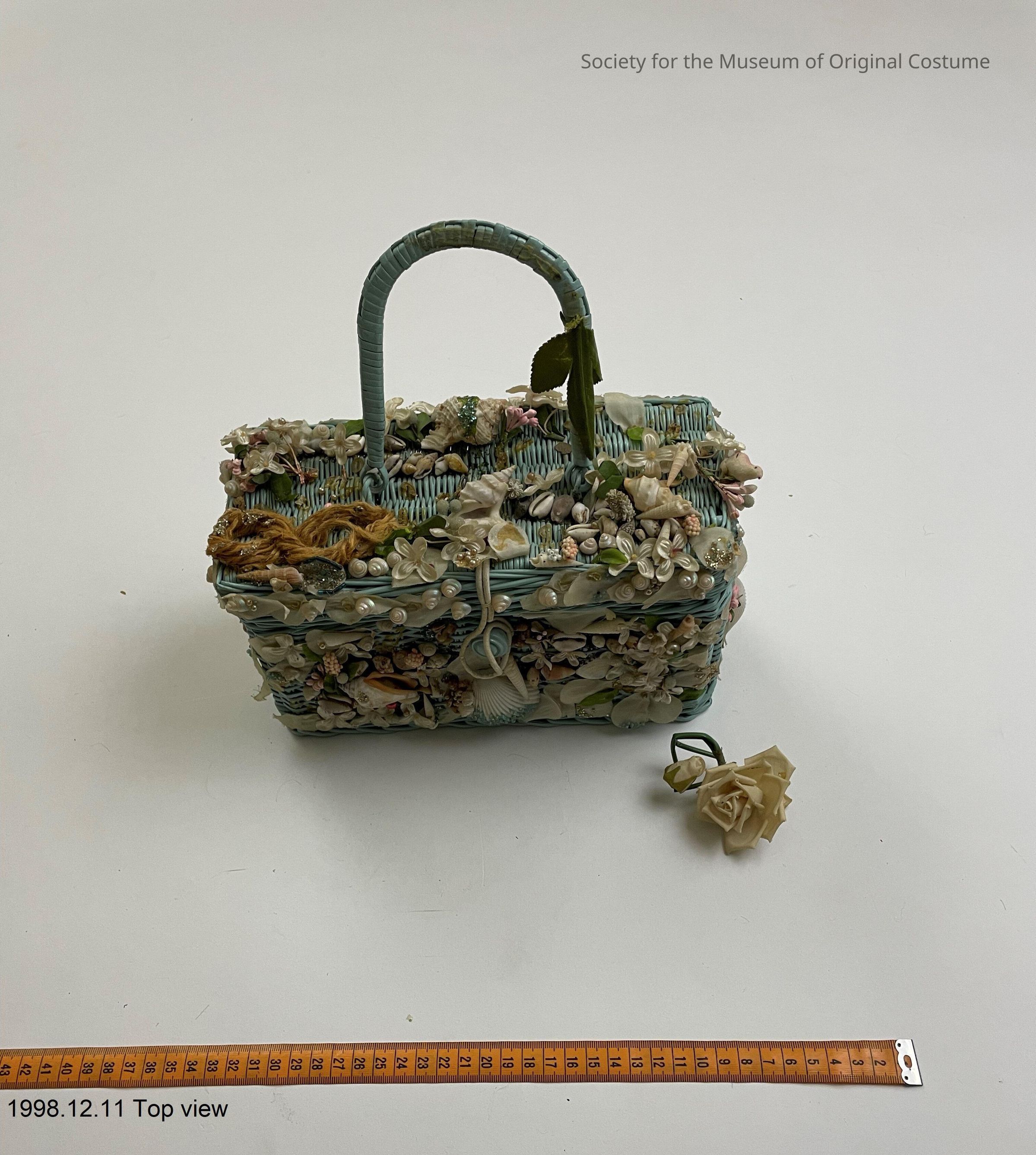Pale blue wicker handbag (Part A) with a removable lid (Part B). Both handbag and lid are basket woven. Handbag is squat and rectangular, with a flat bottom. Outside of handbag as well as lid are covered with seashells of various sizes and shades of brown, as well as fake flowers in white and pink. Front of lid has a loop of white elasticated string, while front of handbag has a protruding blue knob.Acquisition