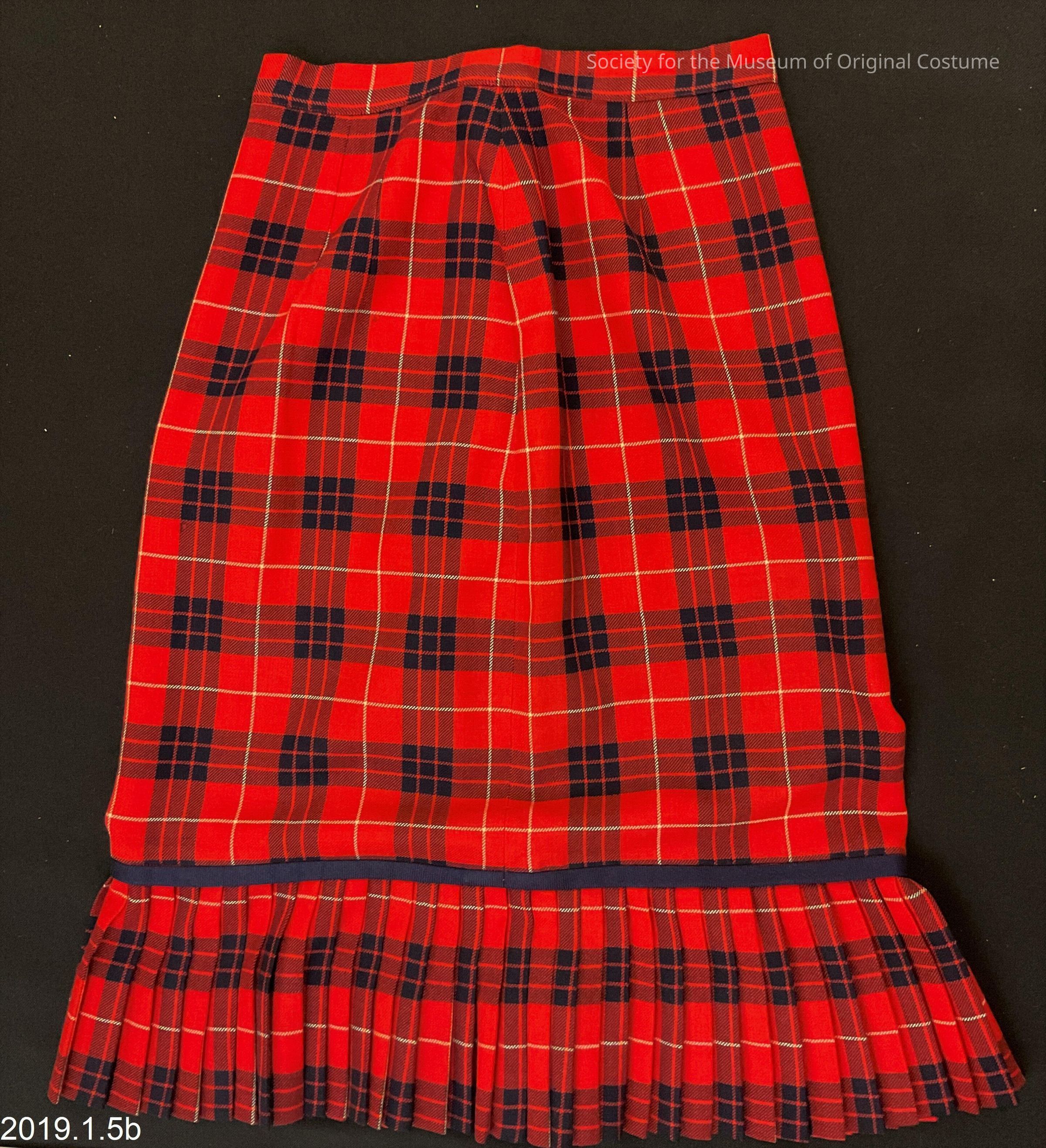 Part B) Red tartan wool skirt. Skirt is mid-calf length and A-line. Edged with accordion pleats. Seam between skirt and pleats is covered with band of blue knit wool. Skirt fastens in rear with zipper and red button.Acquisition