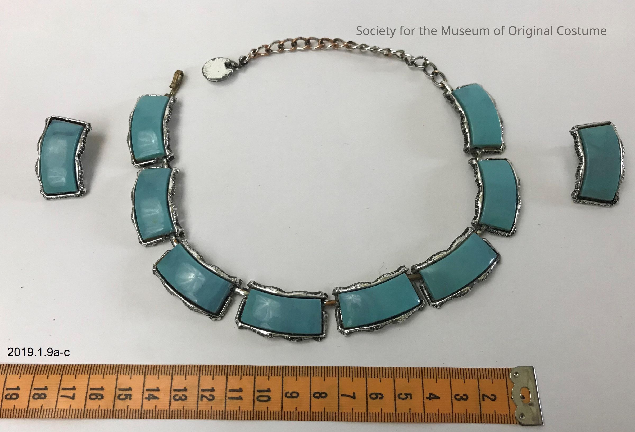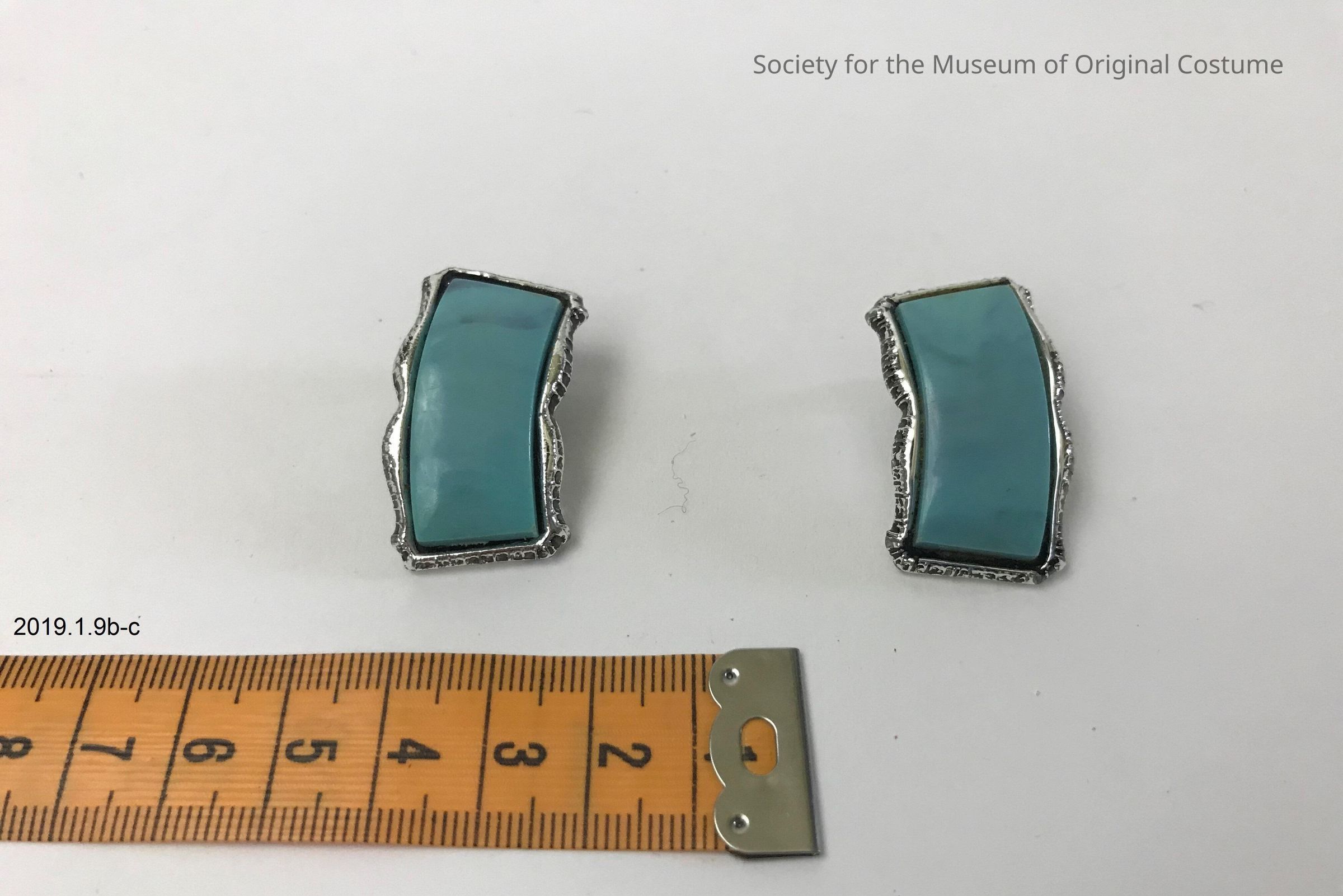 Part B+C) Pair of blue plastic and silver metallic earrings. Same shape as stones that make up the matching necklace. Clip fasteners in back.Acquisition