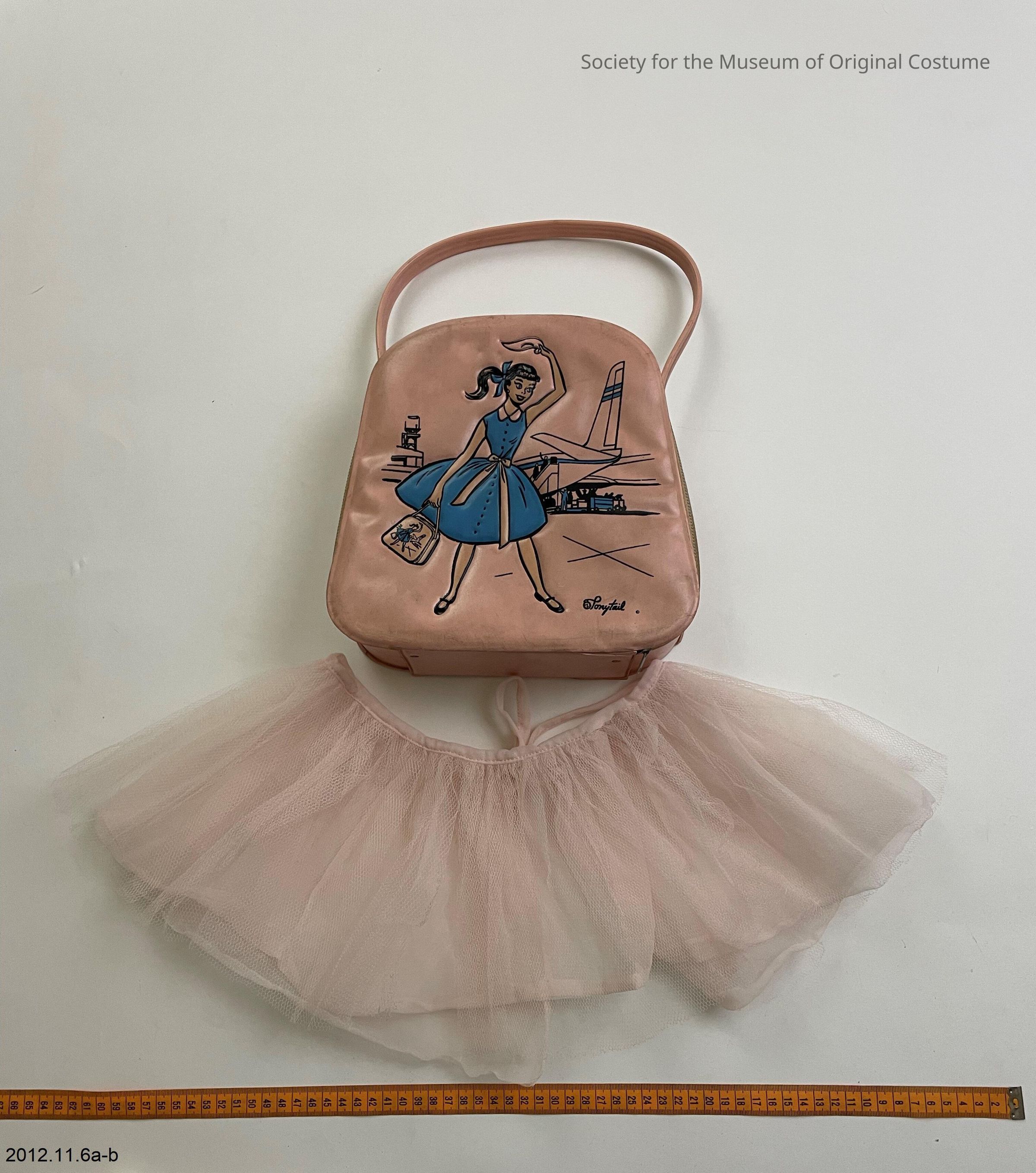 Part A) Pink vinyl handbag. Deep and slightly tapered rectangular shape with a single handle attached to the top. Bag stands upright on a flat bottom. Bag has a "Dandy" zipper which closes across the sides and top of bag. Front of bag depicts a young woman in a full-skirted blue shirtwaist dress, black Mary Jane shoes, and black hair tied into a ponytail with a blue ribbon. In her right hand she is holding an identical bag as this artifact, while her left hand is waving and holding a handkerchief. She is standing on an airport tarmac. Behind her is an airplane which is being boarded as well as loaded with cargo. Several figures are standing around the airplane with their arms also raised as though waving. Inside the bag is a broad pink band and a small rectangular mirror.