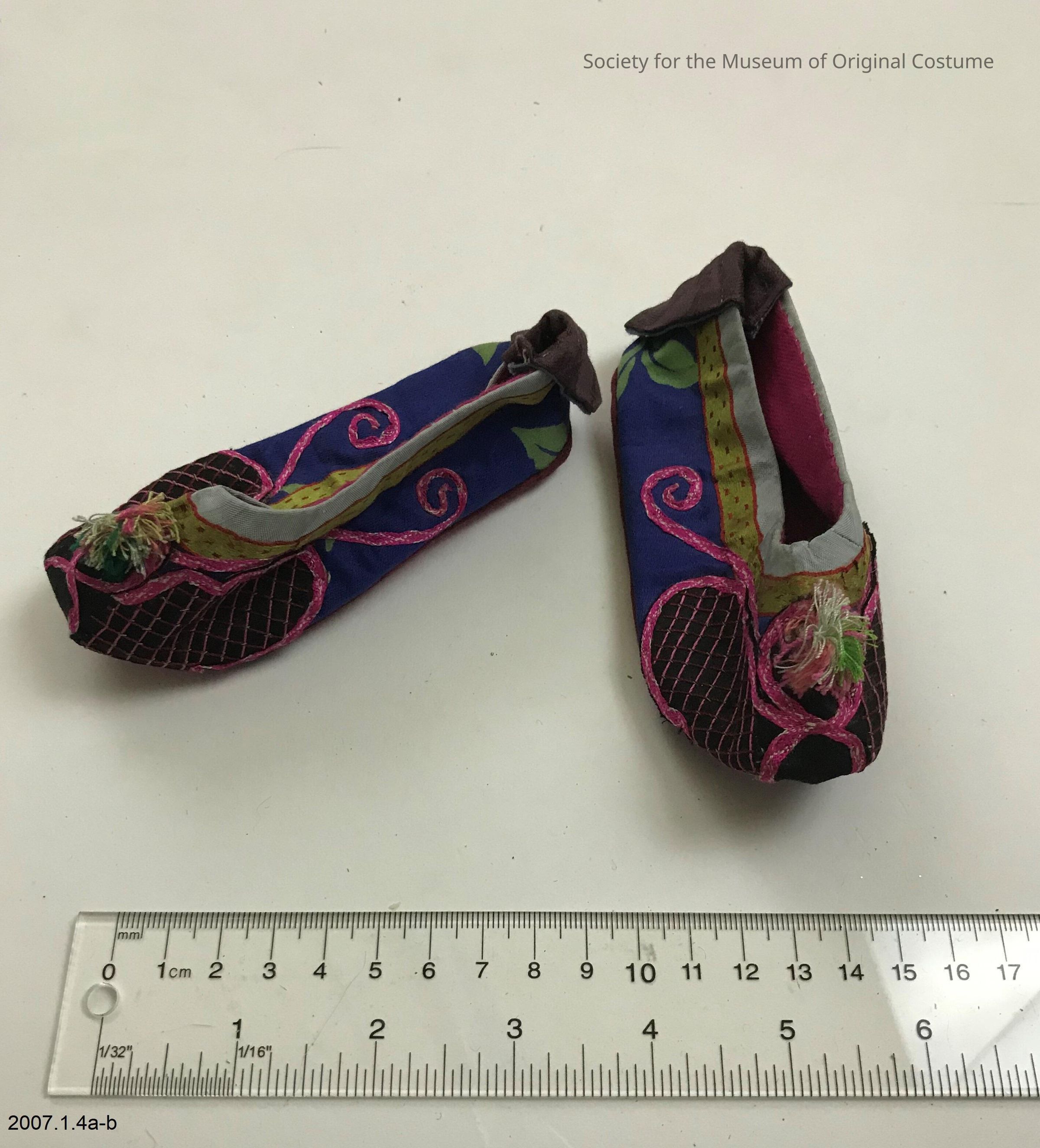 Pair of silk slippers for a young child. Consist of polychromatic embroidered cloth over a stiff interfacing. Soles are hot pink and made of a stiff material attached to bottom of slippers with running stitch in white thread. Topline of slippers run from ankles to near the end of the toe box. Toe boxes are rounded. Each slipper has a pink, white, and green pompon on top of the toe box. Inside of slippers lined in hot pink.Acquisition