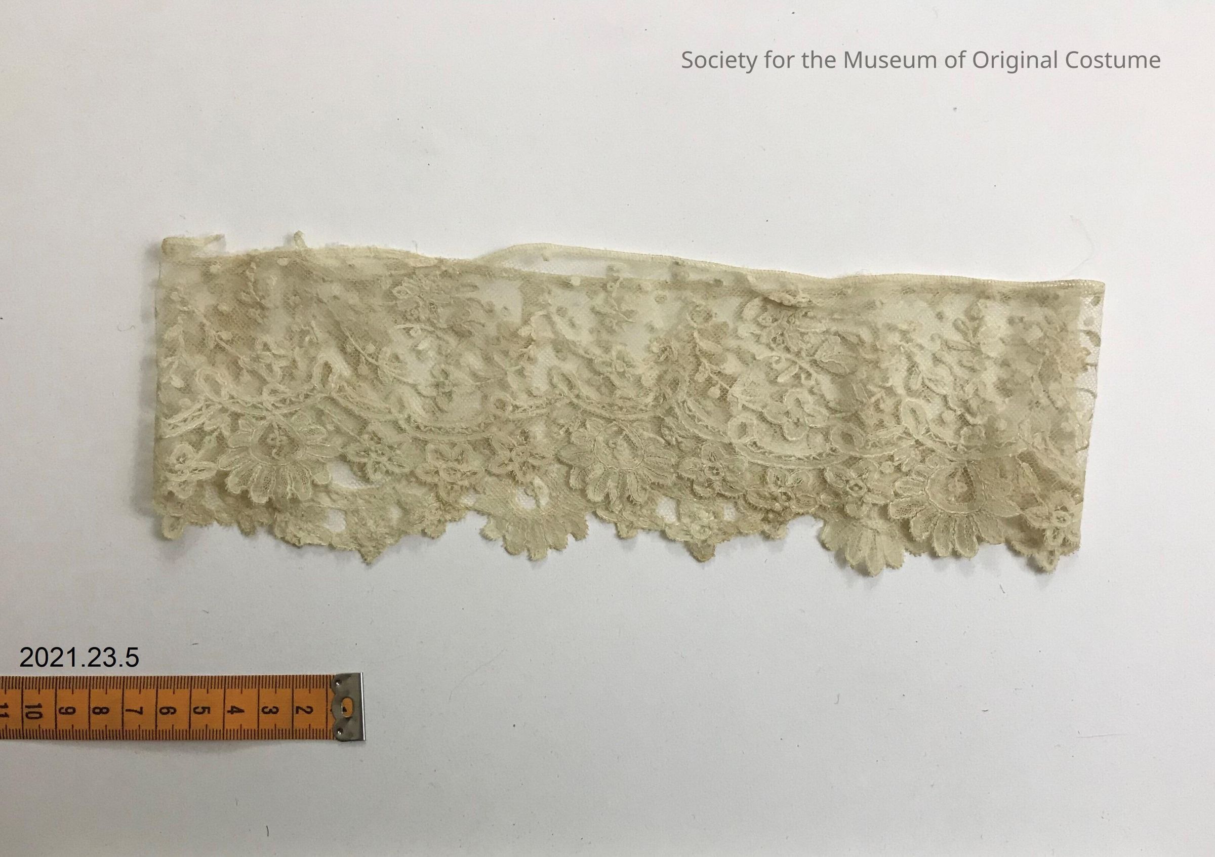 Ivory duchesse (?) lace. Worked in a circle. Floral motif. Scalloped bottom edge.