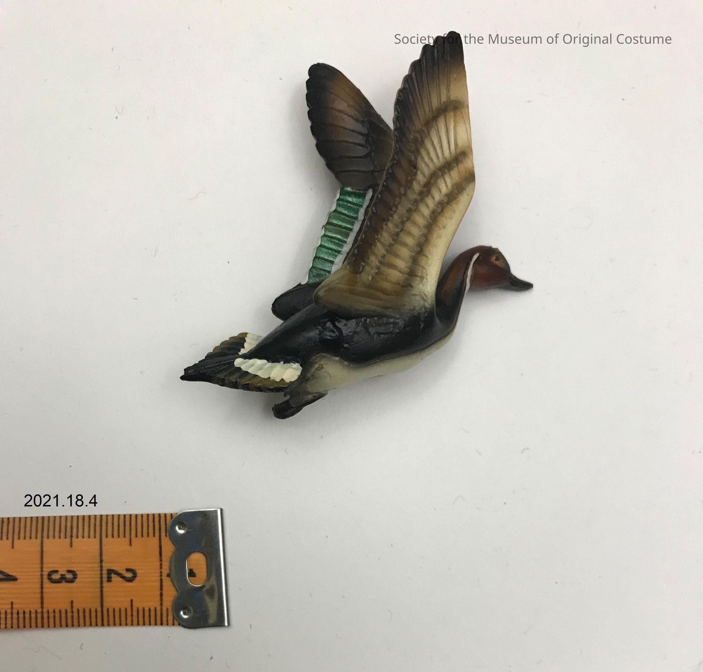 Duck brooch depicting a pintail male. Three-dimensional. Resin-cast and hand-painted. Depicts a pheasant posed mid-flight, with its neck stretched, tail straight, feet tucked into its body, and wings posed at the peak of their upstroke. Eyes and tail and wing feathers are visible in resin model. Back of brooch is flat and unpainted, revealing resin. Silver metal brooch pin is adhered semi-vertically to back. Large section of green paint on tail has chipped off, revealing brown resin underneath.Use