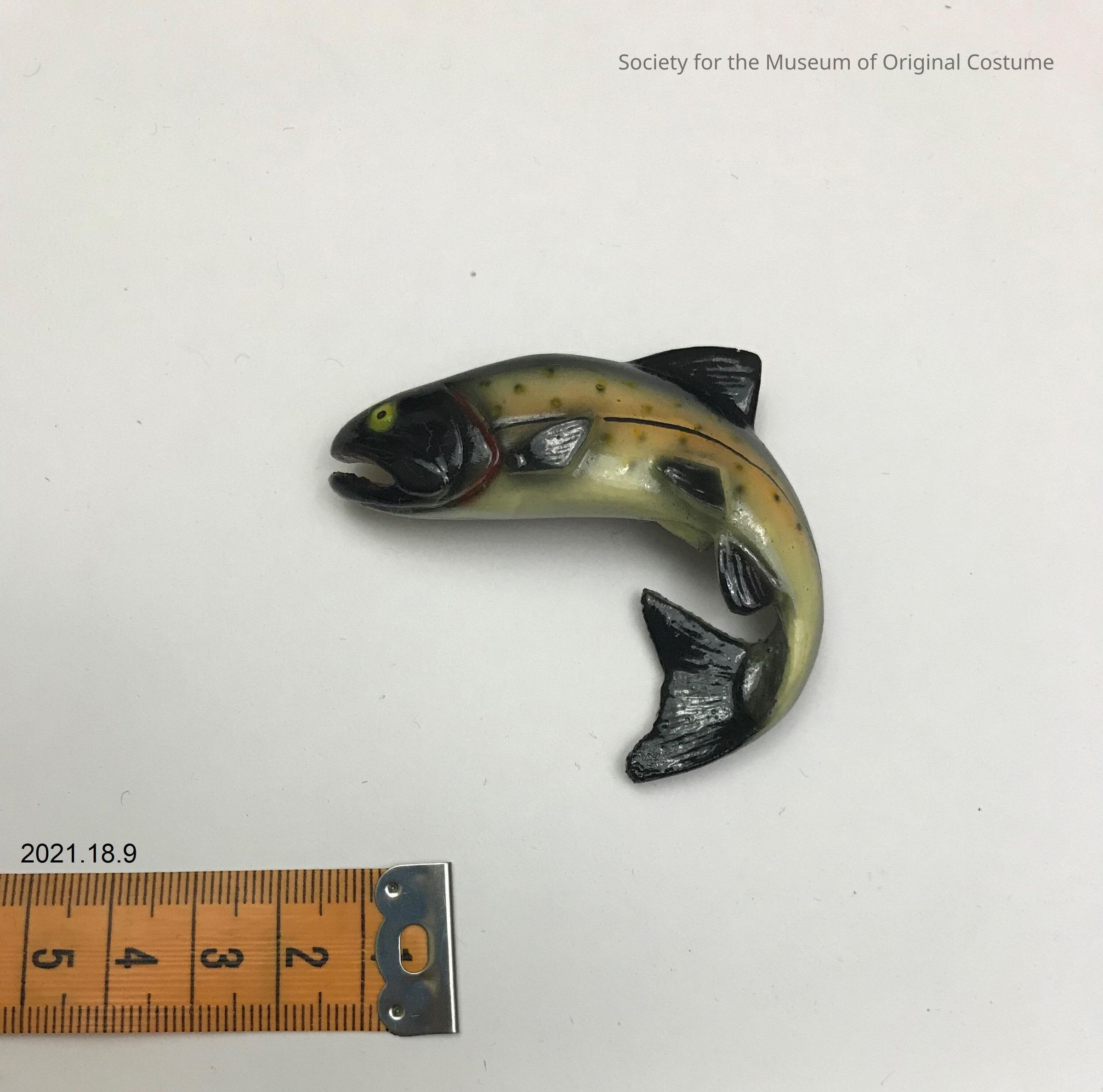 Rainbow trout brooch.Three-dimensional, viewed from the side. Resin-cast and hand painted in naturalistic colours. Brooch depicts a trout posed mid-leap, with its mouth open and tails curved dynamically underneath its body. The eye and fins are visible in resin model. Back of each brooch is flat and unpainted, though marked with some (presumably) accidental paint spots. Silver metal brooch pin is adhered horizontally to back.