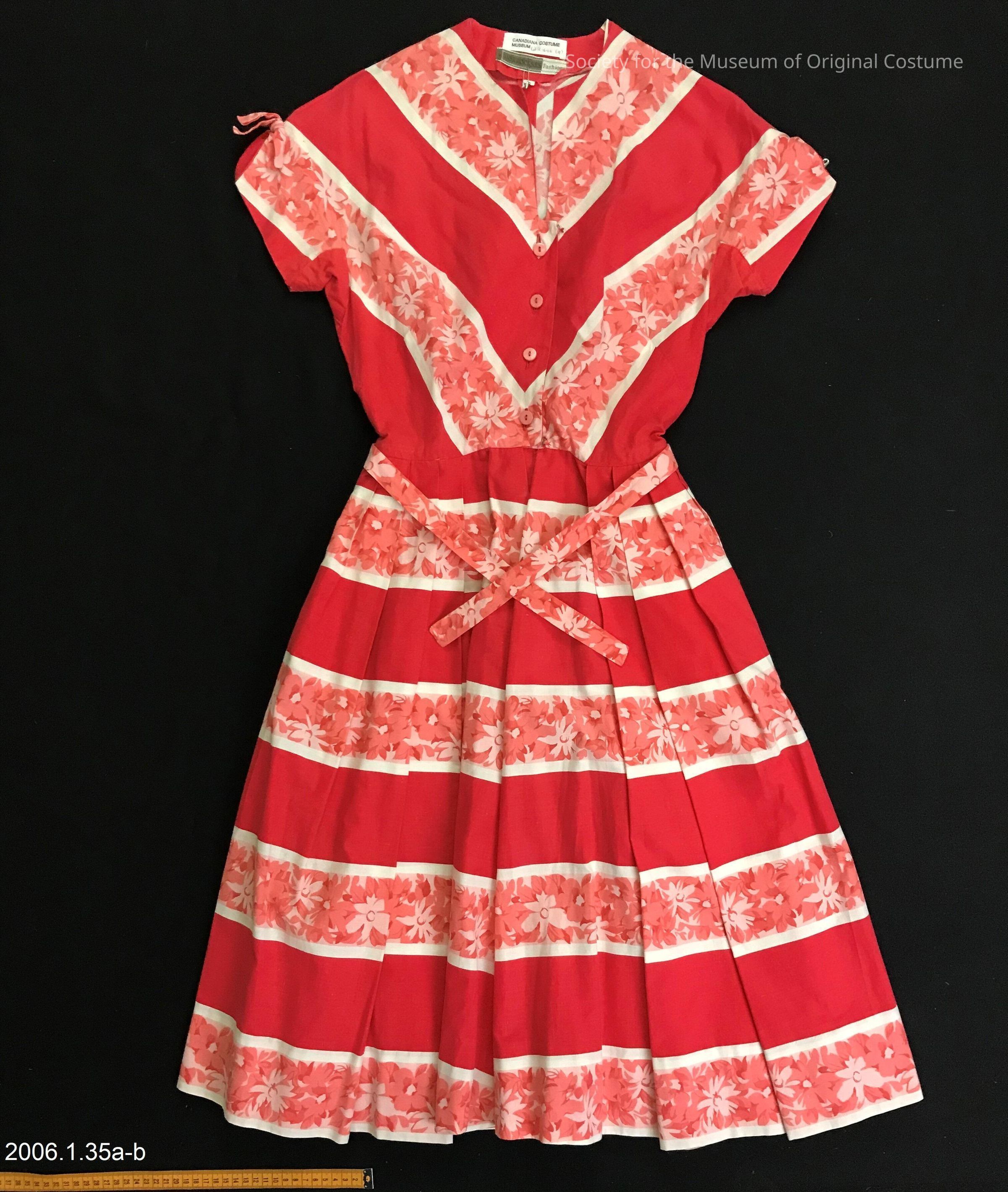 Part A) Red cotton day dress. Horizontal bands of coral floral print. On bodice, these bands form "V" shape. Knee length. Round neckline with plunging "V" in center front. Short sleeves with ornamental bows. Diamond shaped patches under arms. Natural waistline. Skirt is full and knife pleated. Closes in front with four peach buttons and hook-and-eye closure.