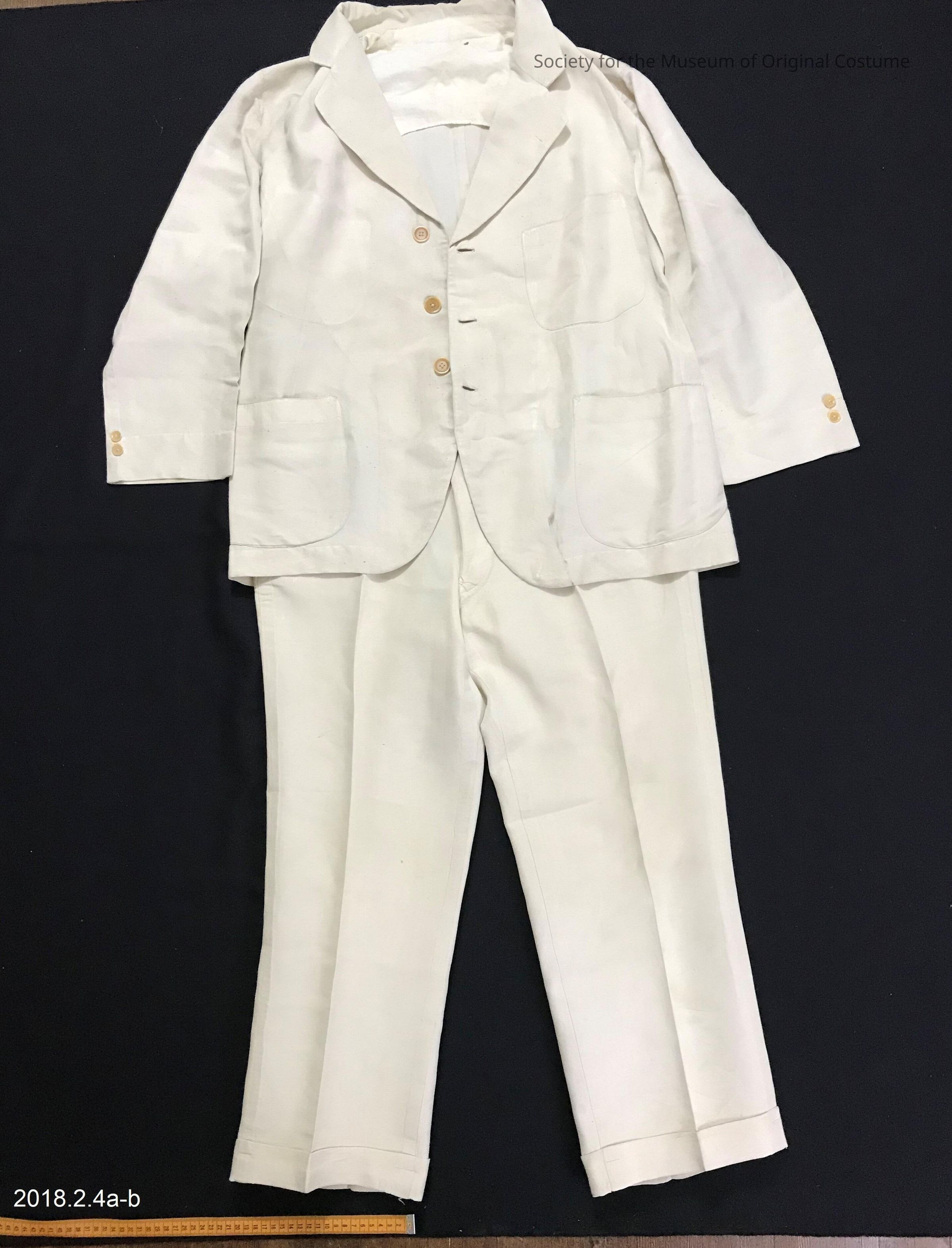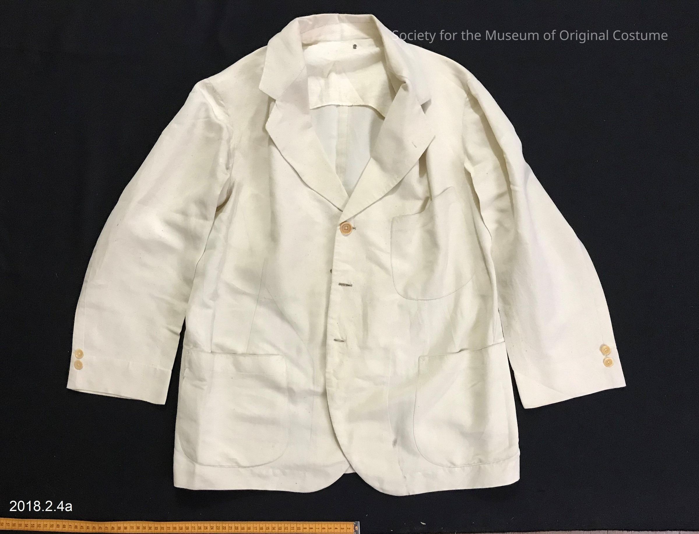 Part A) Ivory silk men's summer suit jacket. Flat collar and notched lapel. Cotton yoke inside jacket. Full length sleeves, each with two decorative yellow (discoloured?) buttons on the cuff. Darts at front. Jacket has two patch pockets on the left front and one single patch pocket on the right front. Jacket interior has one patch pocket on both the left and the right front panels. Three button closure down centre front. Brown discolouration on jacket interior and black speckles across exterior front.