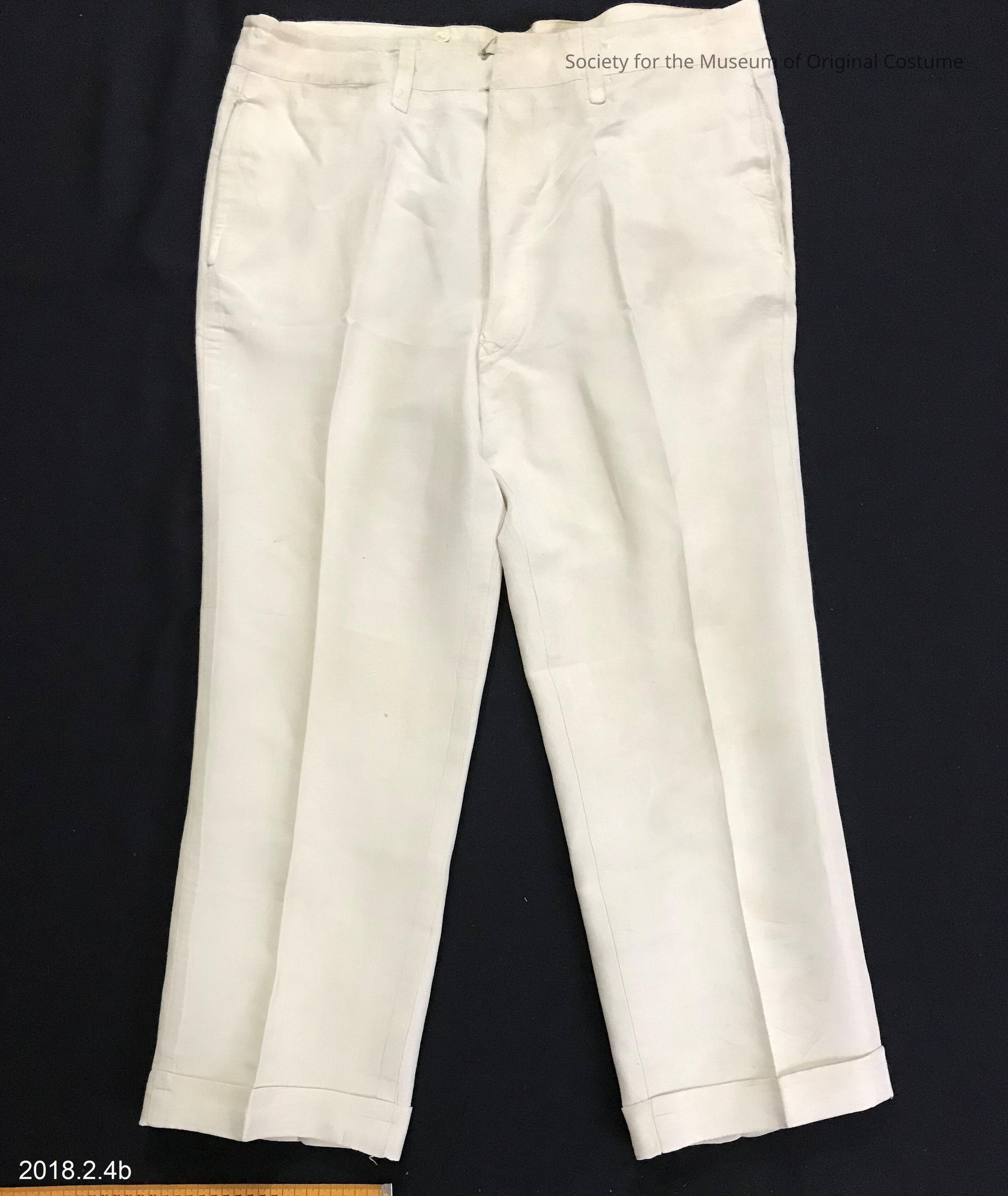 Part B) Ivory silk men's trousers. 1 3/4" waistband. Seam pocket at both right and left front of trousers, with decorative stitching. One vertical slit pocket at waistband on right front. Four button fly closure at center front, along with a French bearer fly. Six suspender buttons inside waistband. On rear of trousers are two double-welt pockets with single button closure. Hems are cuffed. Dark brown discolouration on right pocket lining, inside trousers.Use