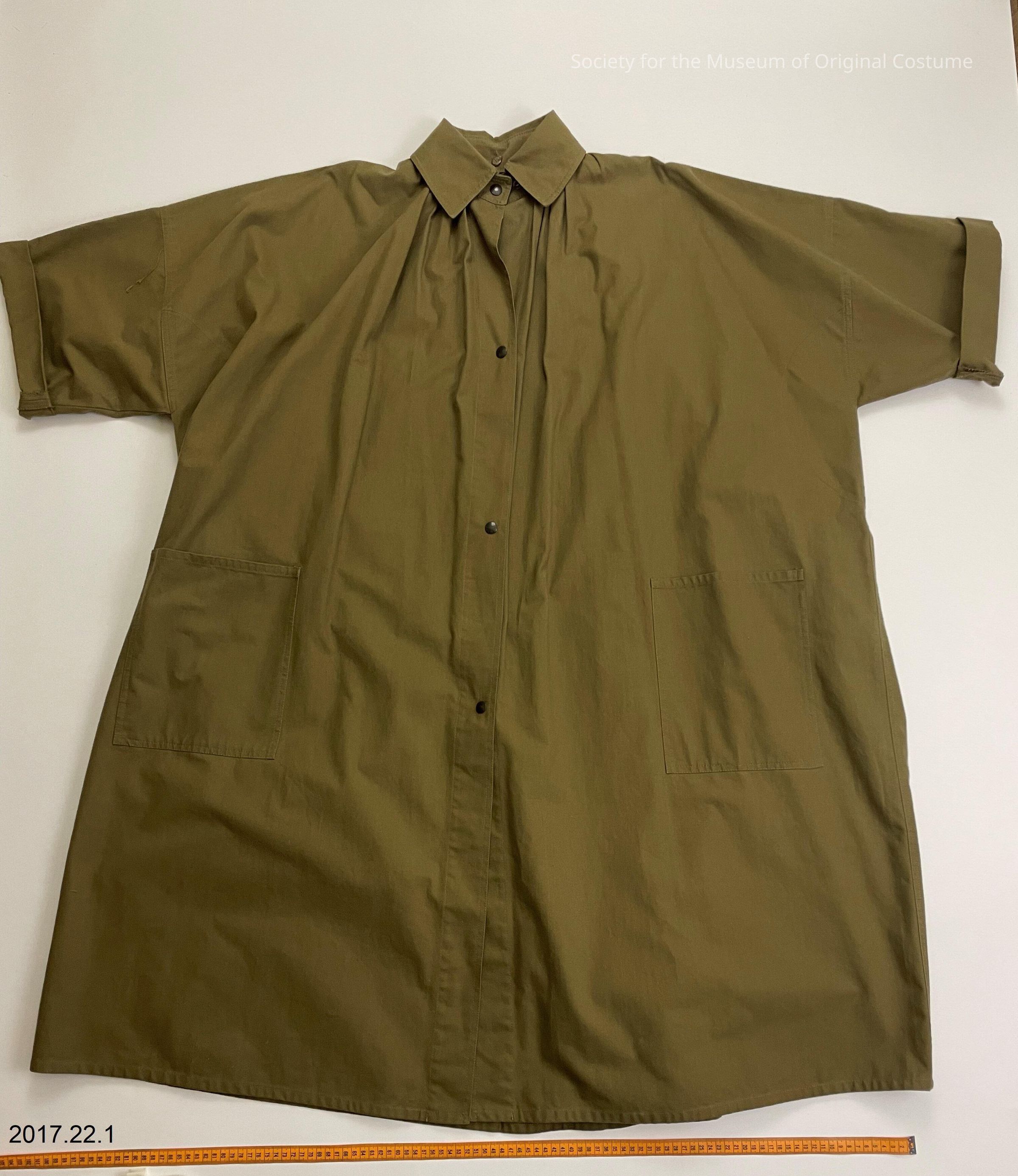 Olive green cotton raincoat. Calf-length. Body of raincoat is broad and rectangular with a center front opening. Detachable flat collar that fastens inside jacket neckline with three brown buttons. Front of jacket is pleated at both the left and right front of the collar. Rear of jacket has a broad inverse box pleat at center rear, bordered on either side by accordion pleating. Jacket has short sleeves with single rolled cuffs. Front of jacket has two large square patch pockets at hip height, one on the left and one on the right flap. Four snap fasteners down center front.Acquisition