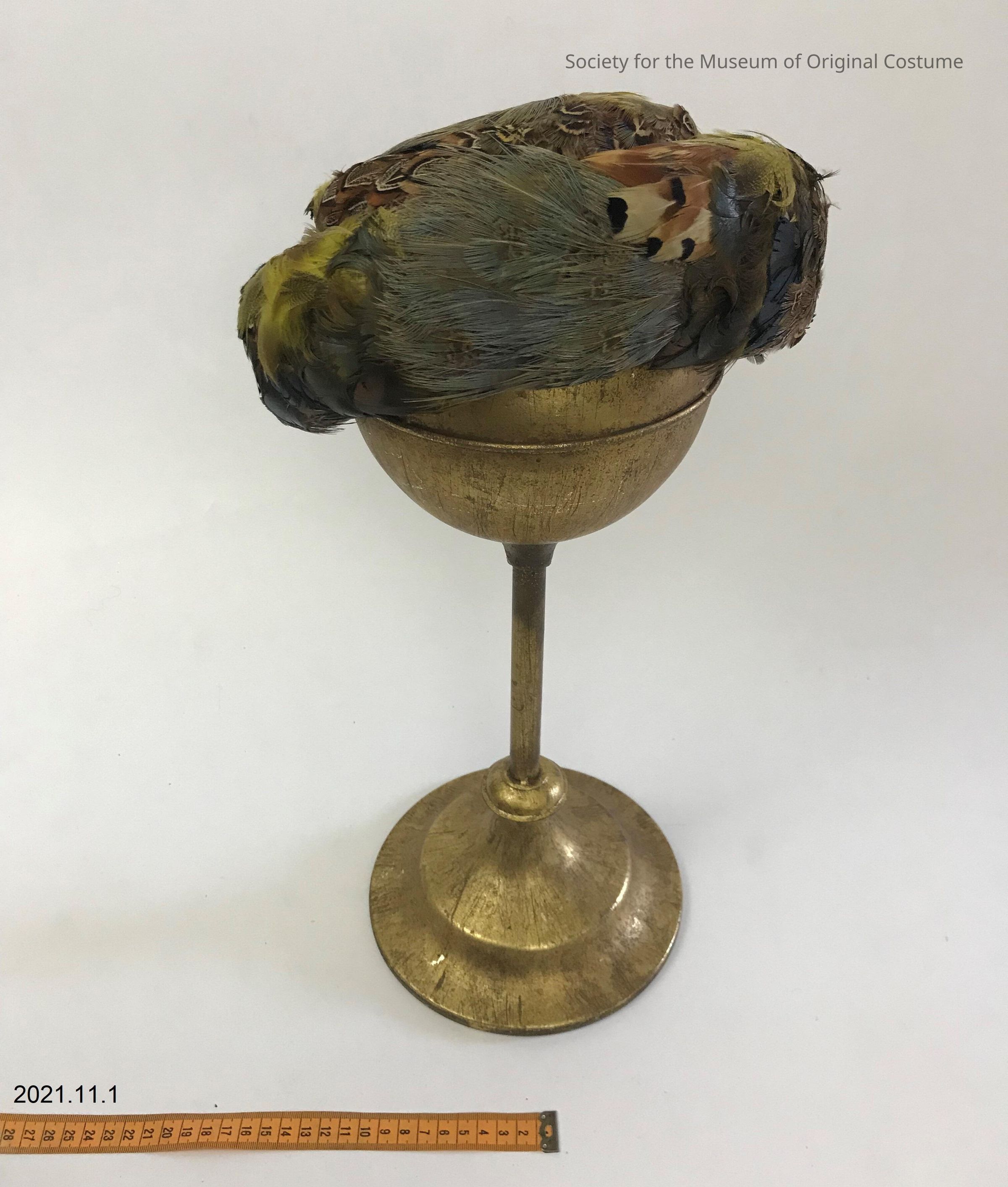 Hat covered with a variety of brown, moss green, and iridescent feathers. Straight crown with flat top. Brim is upturned all around crown. Inside brim is a red-brown sweatband. Inside of crown is lined with cream fabric.Acquisition