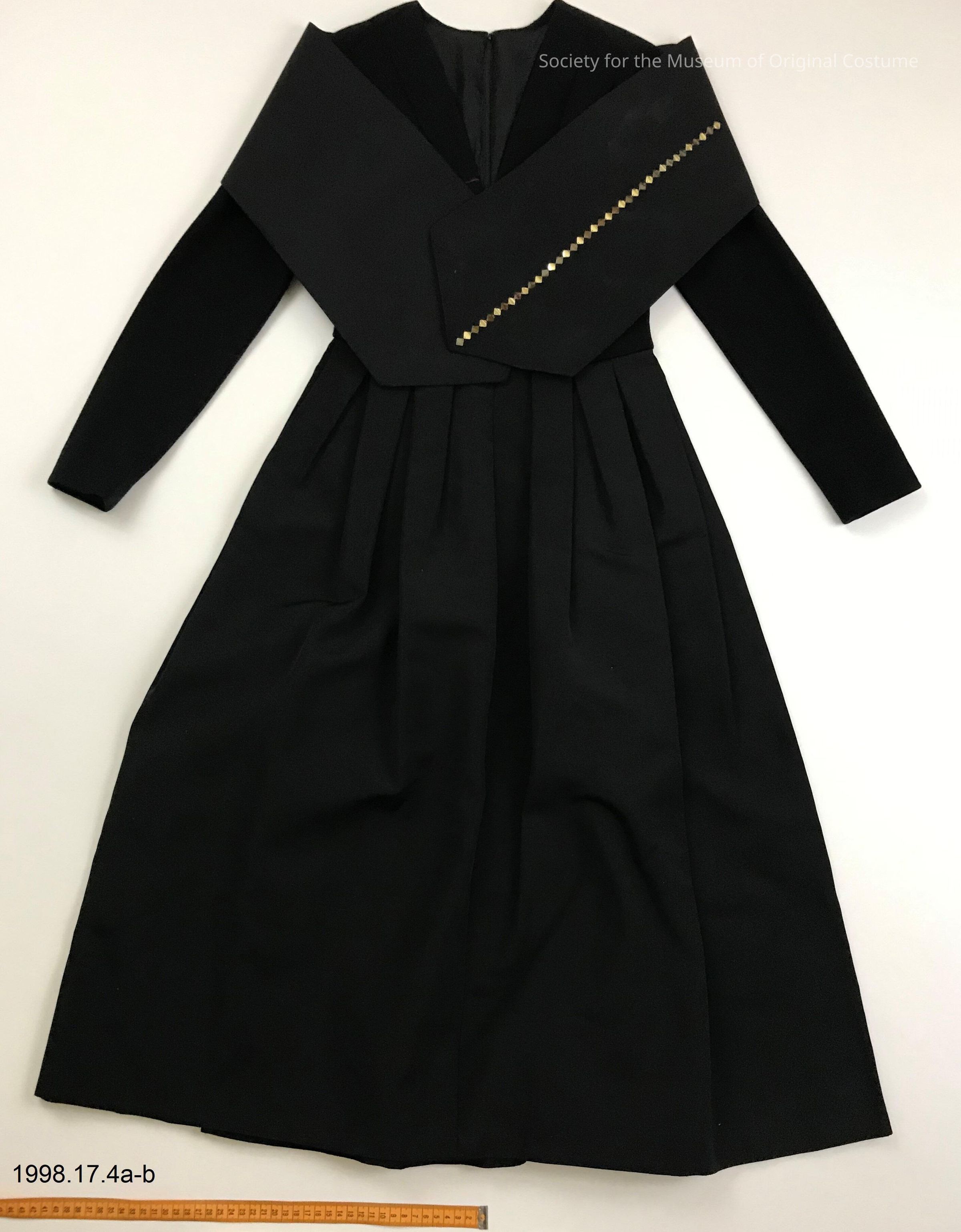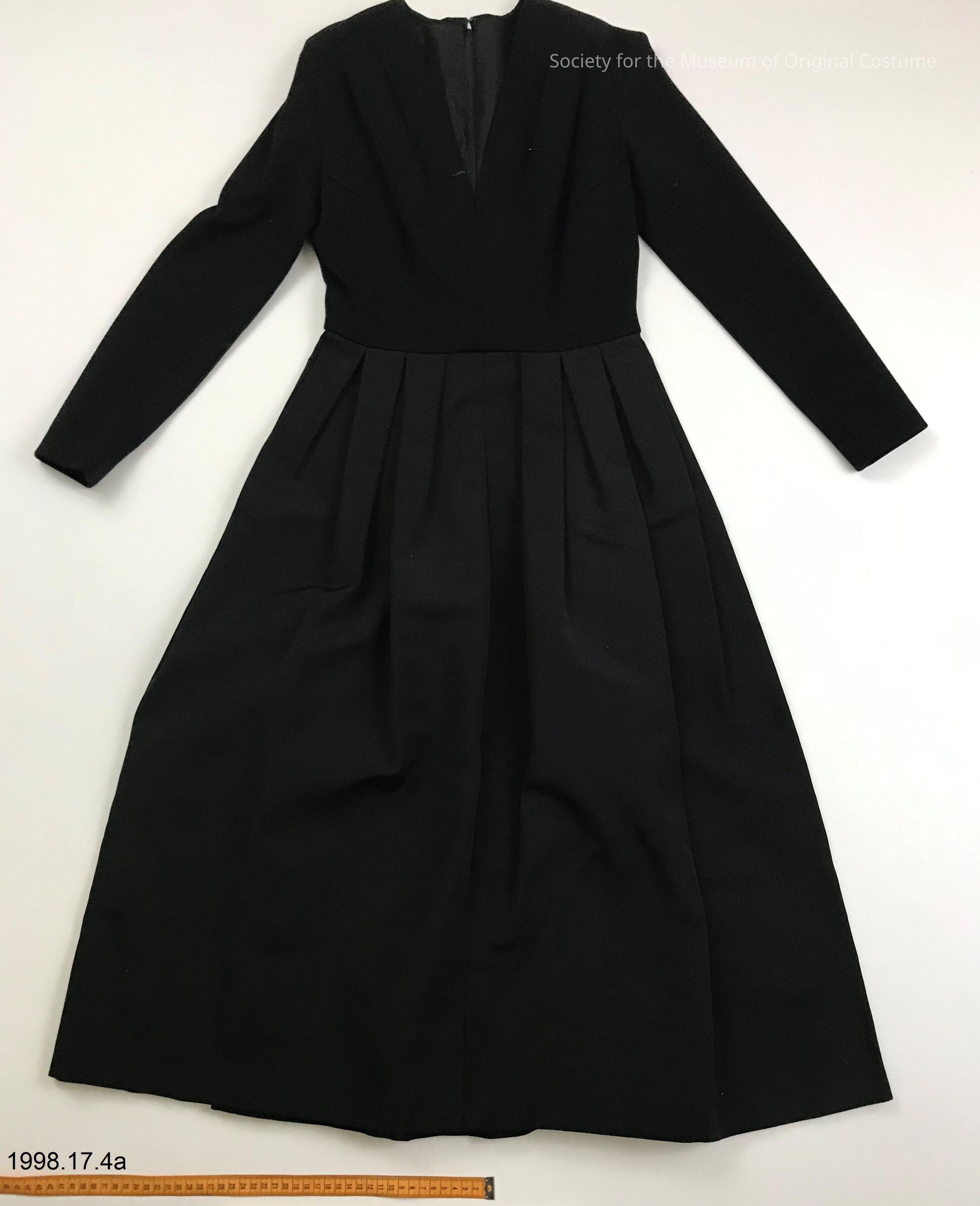 Part A) Black wool and taffeta evening gown. Wool bodice. Low "V" neck. Wrist-length sleeves. Box pleat at left and right shoulder. Darts in bust. "Eflon" zipper closure down center back of bodice. Natural waistline. Skirt is taffeta, A-line, and calf-length. Box pleats in skirt around waist. Dress is lined with black satin.