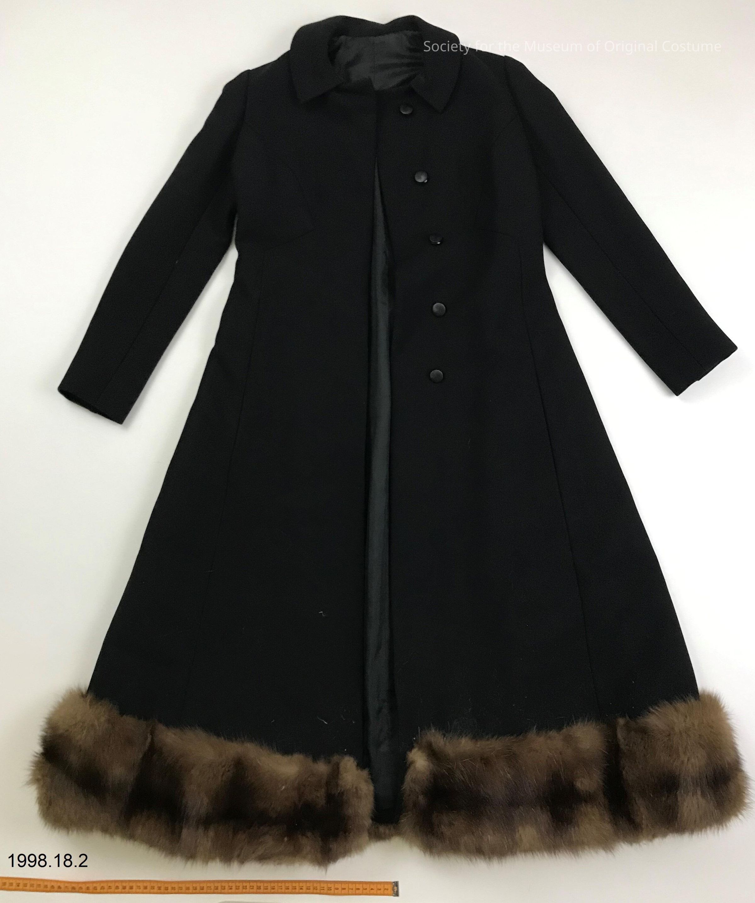 Black woman's coat with brown fur trim at hem. Flat, folded collar with straight neckline. Darts at back of neck. Straight, wrist-length sleeves. Open from neck to hem. Single breasted, with concealed buttoned closure down top half of front. Shaping at bust. Seam pockets on left and right side seam.Black lining. Fur trim is detaching at right front and shedding heavily.Acquisition