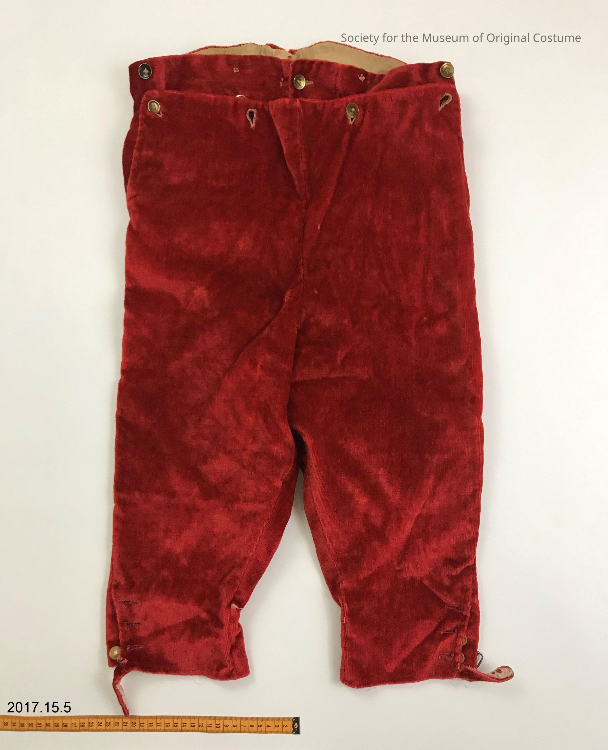 Red breeches. Square panel at front seat of breeches, fastened along the top and side edges with gold metallic buttons. Button fly down center front of waistband. Slash pockets on left and right hip underneath square panel. Legs are knee-length and tapered, with combination button and buckle closure at the bottom hem. Brown cotton lining waistband.Acquisition