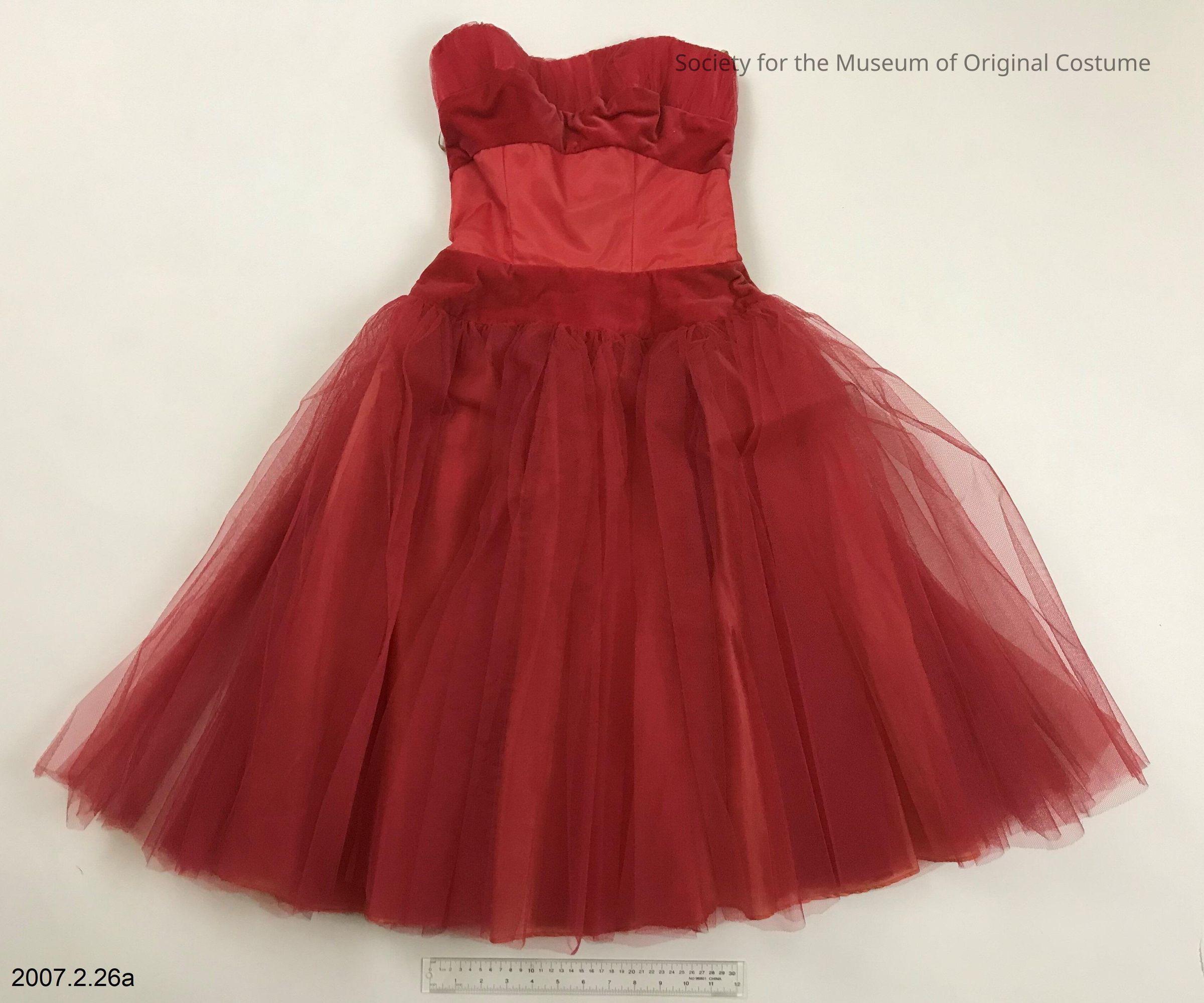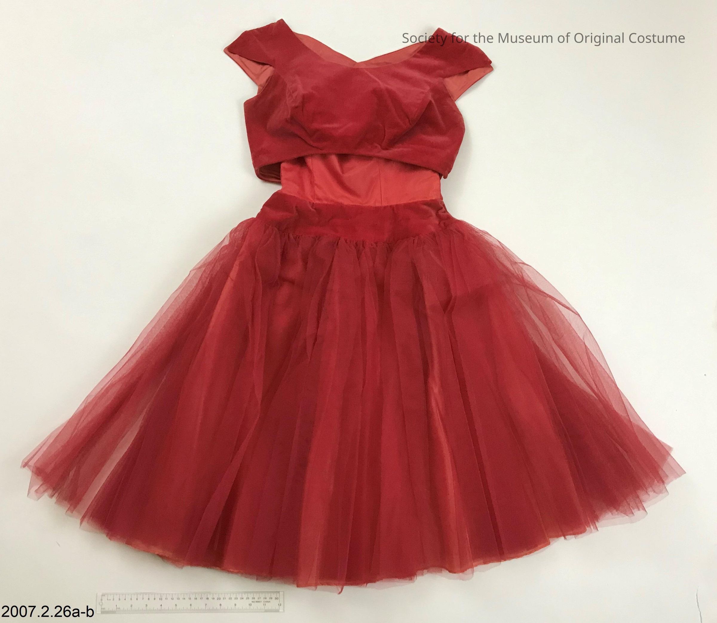 Part A) Red velvet and netting cocktail dress. Sleeveless, with a sweetheart neck and shaped bust. Bodice is composed of a red velvet and netting layer over a red synthetic fabric lining. High waist. Skirt is gathered at waist and about knee-length. Skirt is composed of red netting over a pink synthetic underskirt. "Serval" zipper closure down back of bodice.