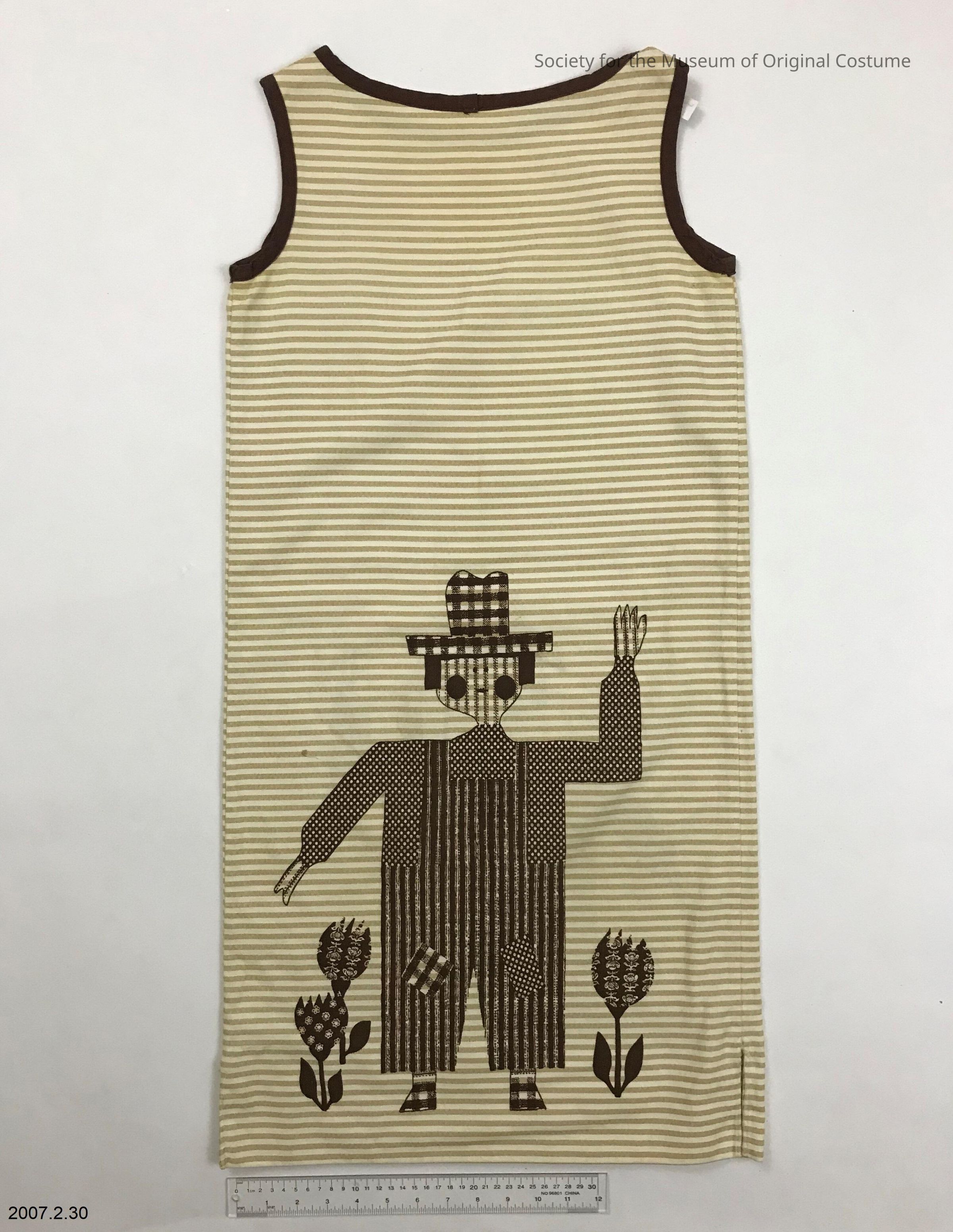 Ivory and beige striped shift dress. Wide rounded neckline and no sleeves. Both neckline and armholes are edged with brown cotton. Front and back of dress are printed with an image in brown of a waving person with a cheerful expression wearing patched overalls and a tartan hat, standing amidst several flowers.Acquisition