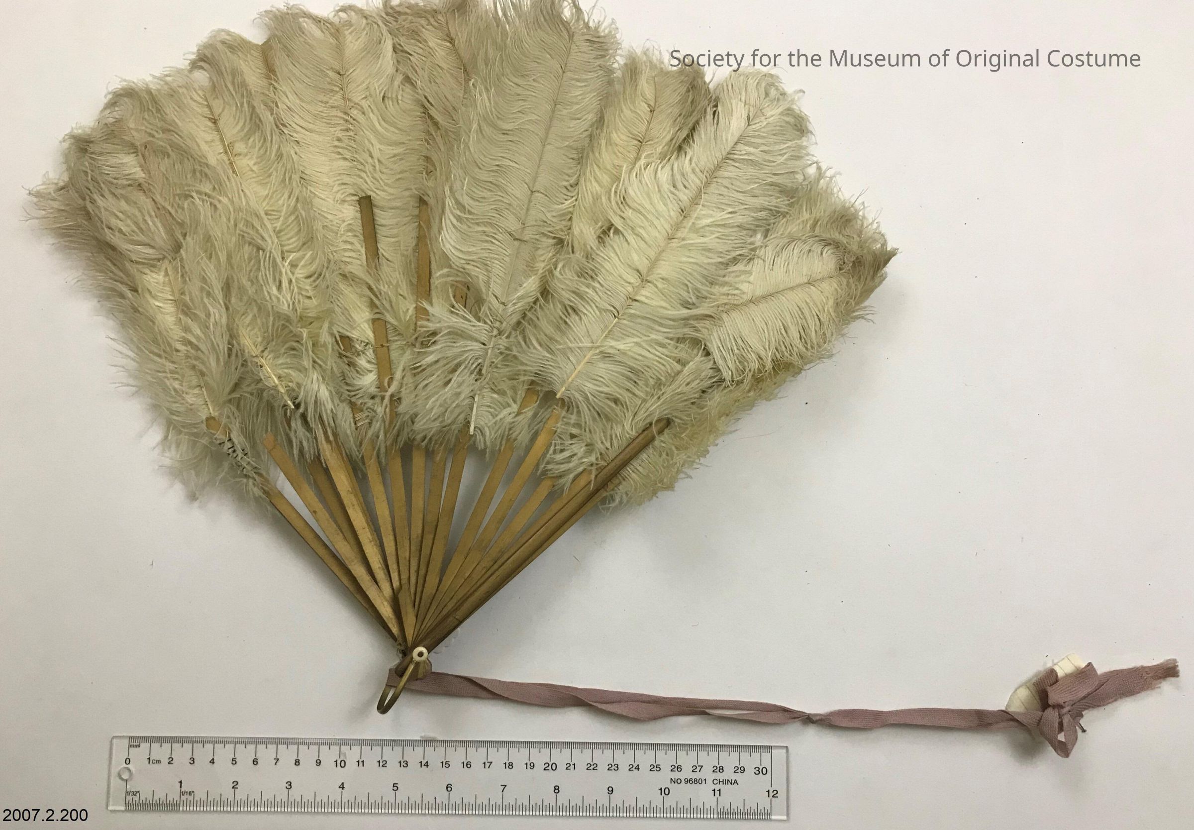 White ostrich feather fan with gold-painted bamboo ribs. No leaf between ribs. Some feathers have fallen off, and one has been bound to a rib with black thread. Gold metallic rivet and loop, which has a dusty pink ribbon tied around it.Acquisition