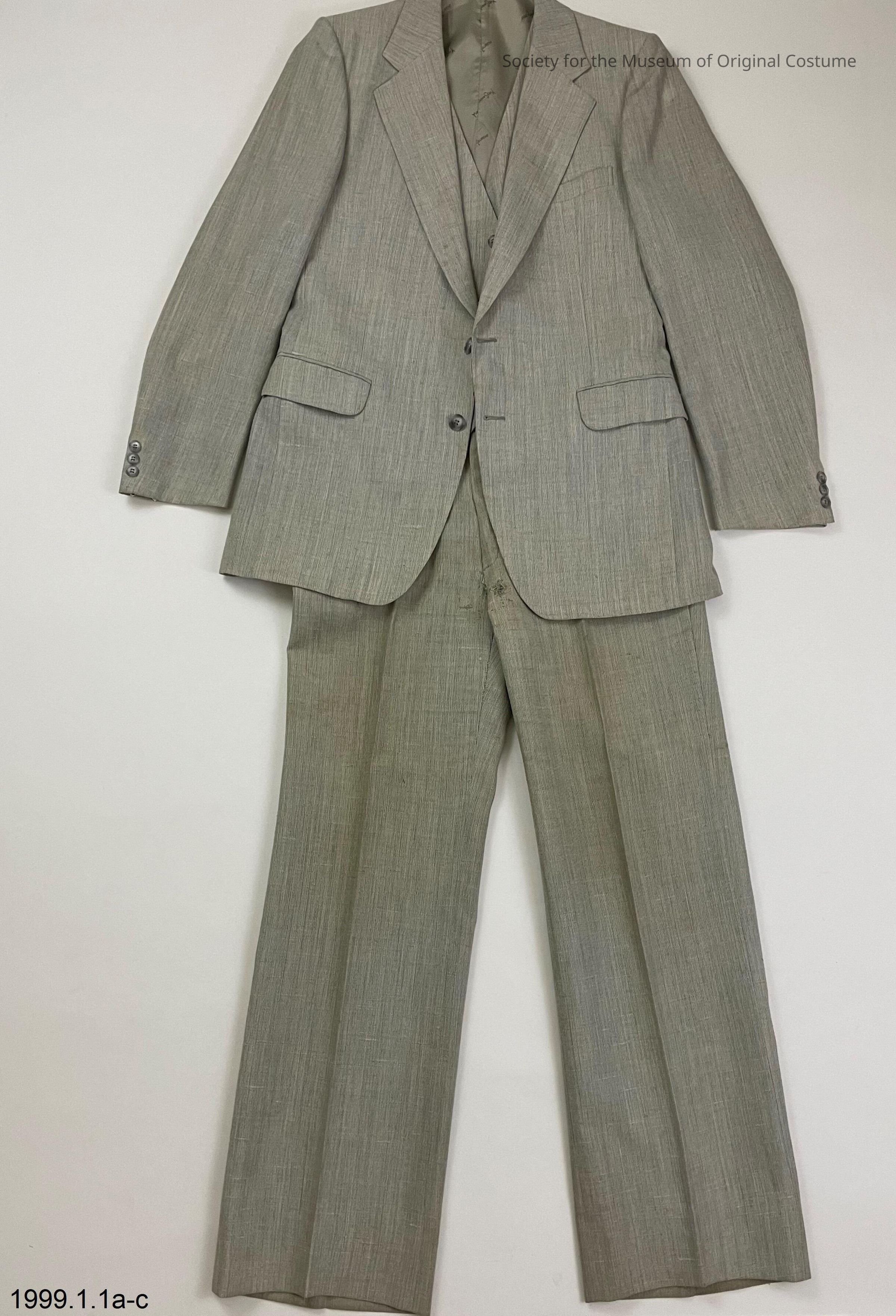 Part A) Man's white and grey plain weave wool jacket. Occasional thick warp threads show throughout garment. Flat and folded collar with a long notched lapel. Wrist-length sleeves with a wrist slit at the outer edge of the wrist opening, closed with four buttons. Single breasted, with a two button closure. Horizontal flap pocket at the left and right front. Back hem of the jacket has double vents. Inside jacket are three double welt pockets; one at the right side and two at the left side. Inside of jacket is lined with shiny grey fabric printed all over with "YVES SAINT LAURENT".