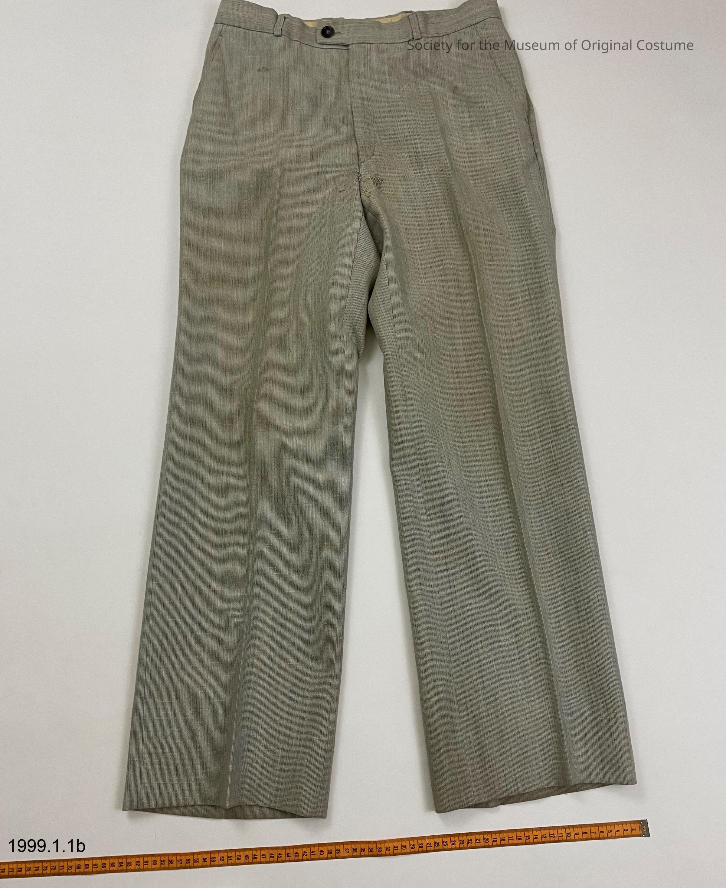 Part B) White and grey plain weave wool pants. "Eclair" zipper fly, button, and "Britafor Patents" hook closure at front of waistband. Darts around waistband, as well as self-fabric belt loops. Inset pocket at left and right side. Double weft pocket with button closure at right back.
