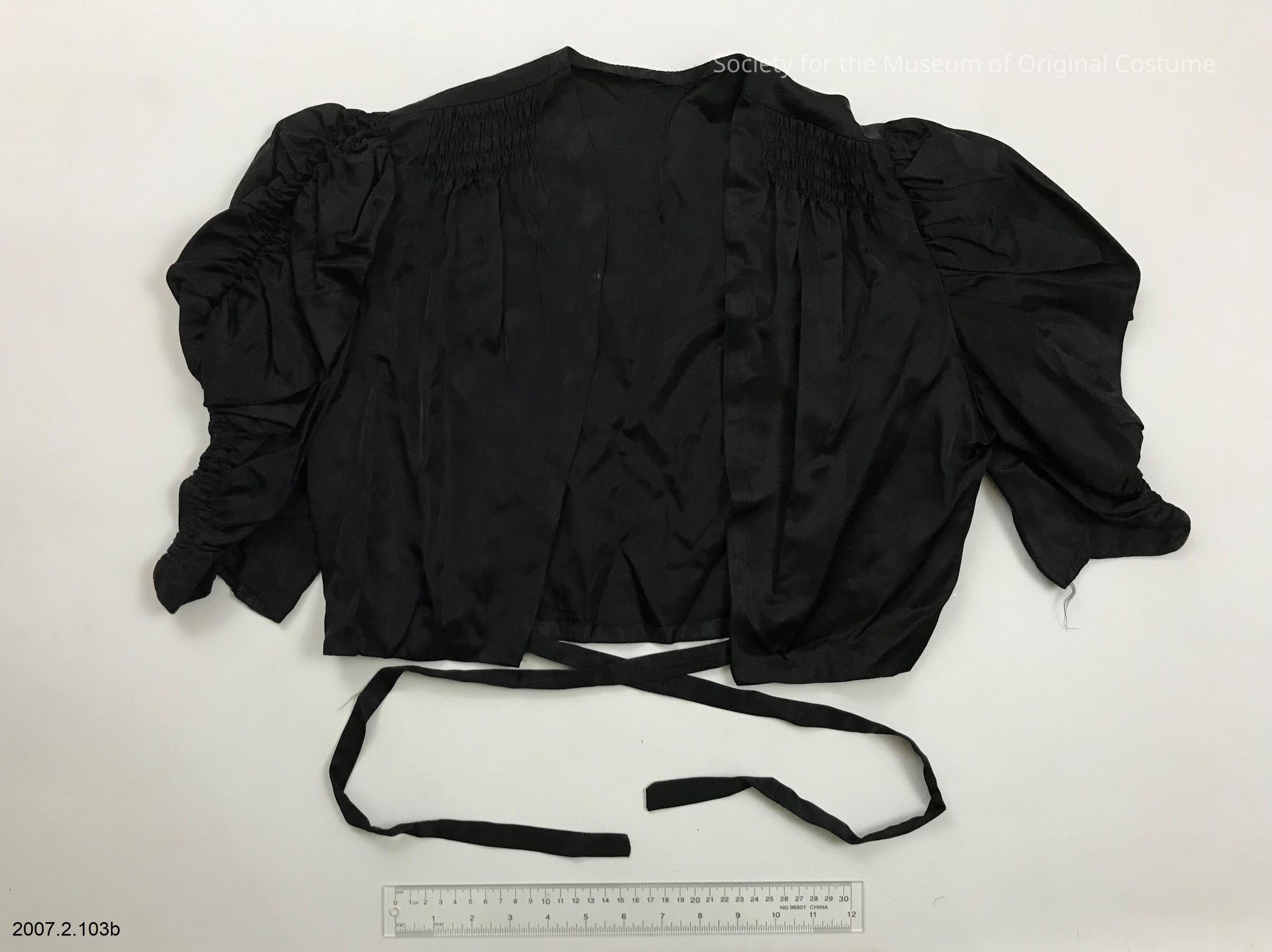 Part B) Black bolero matching Part A. Sleeves are about elbow-length, with large puffed shoulders gathered at the shoulder seams and shirring along the outside seams. Bolero also has shirring along each shoulder. About chest-length. Two self-fabric ties at bottom of bolero.Acquisition