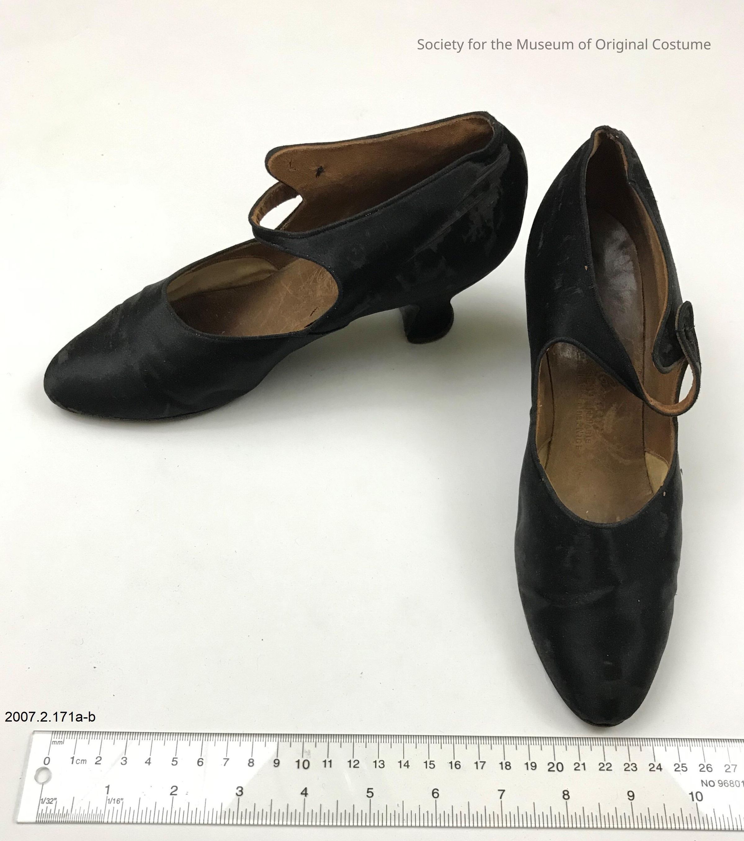 Pair of black satin Mary Jane pumps. Sturdy Louis heels. Both shoes have one thin strap fastened at the ankle with a button, which appears to be missing on both shoes. Shoes are low cut, with narrow and rounded toe boxes.Inside of shoes and insoles are composed of brown leather. Wear and abrasions on bottom of each sole and heel.Acquisition