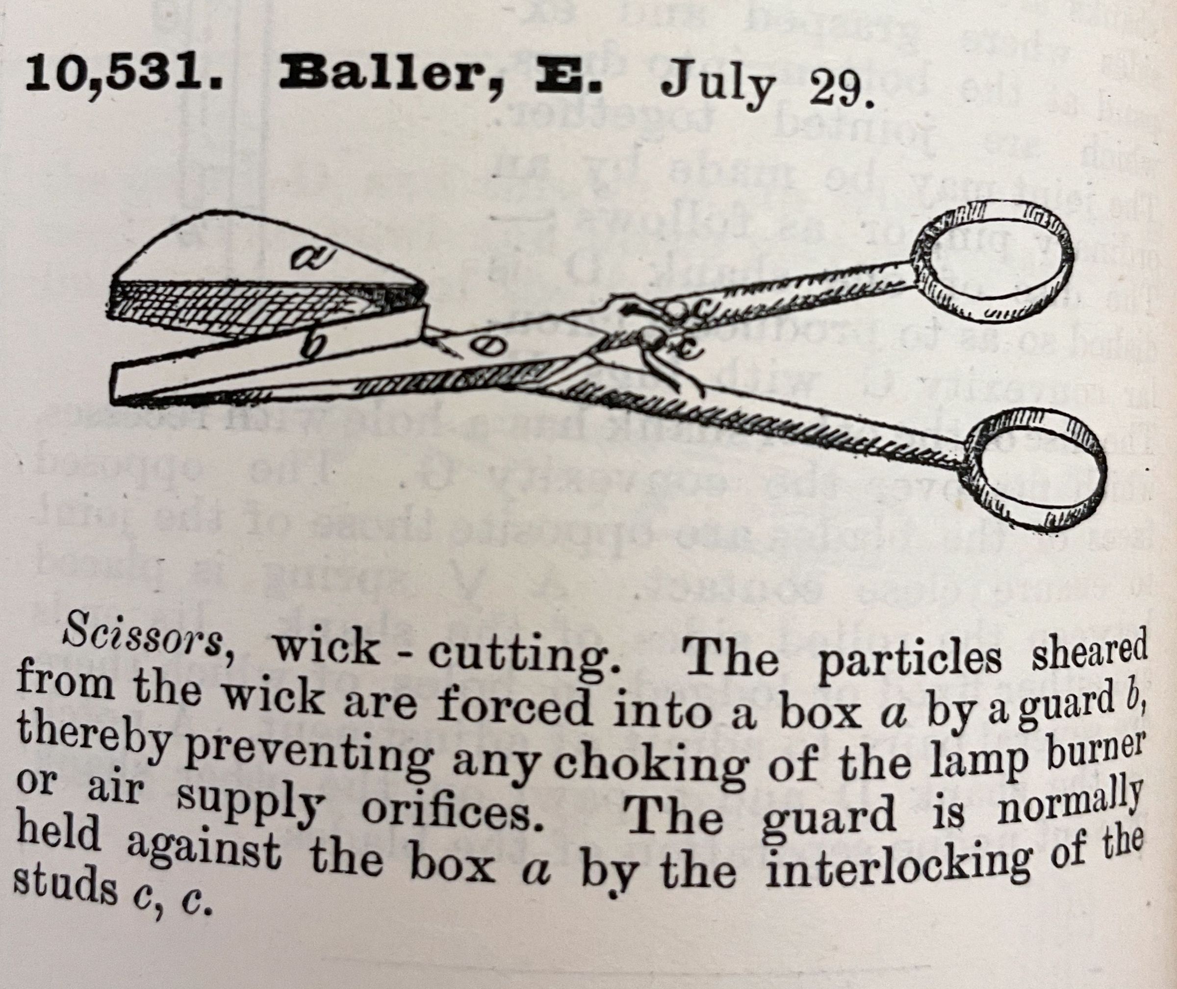 Scissors, wick-cutting. The particles sheared from the wick are forced into a box a by a guard b, thereby preventing any choking of the lamp burner or air supply orifices. The guard is normally held against the box a by the interlocking of the studs, c, c.Cataloged By