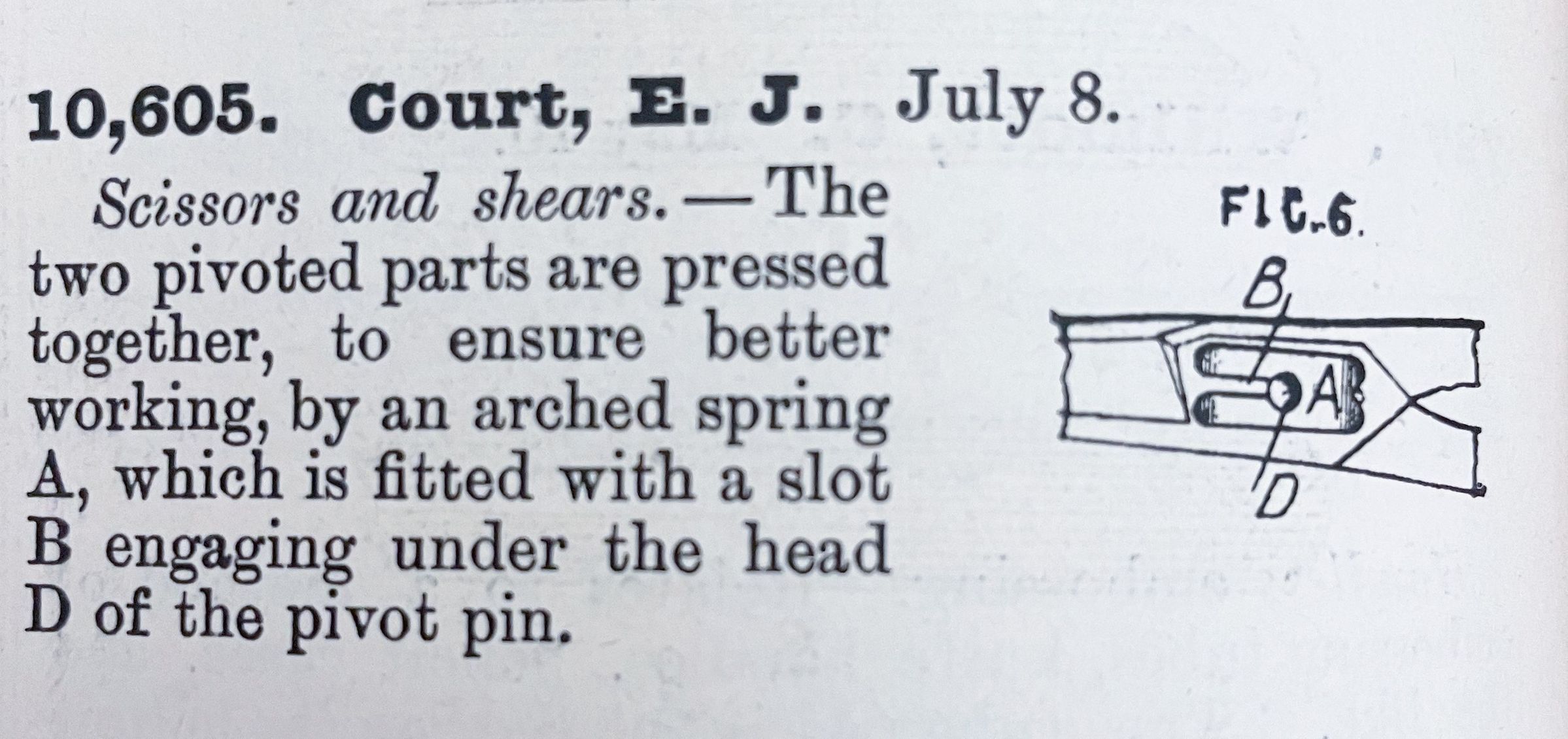 Scissors and shears. -- The two pivoted parts are pressed together, to endure better working, by an arched spring A, which is fitted with a slot B engaging under the head D of the pivot pin.Cataloged By