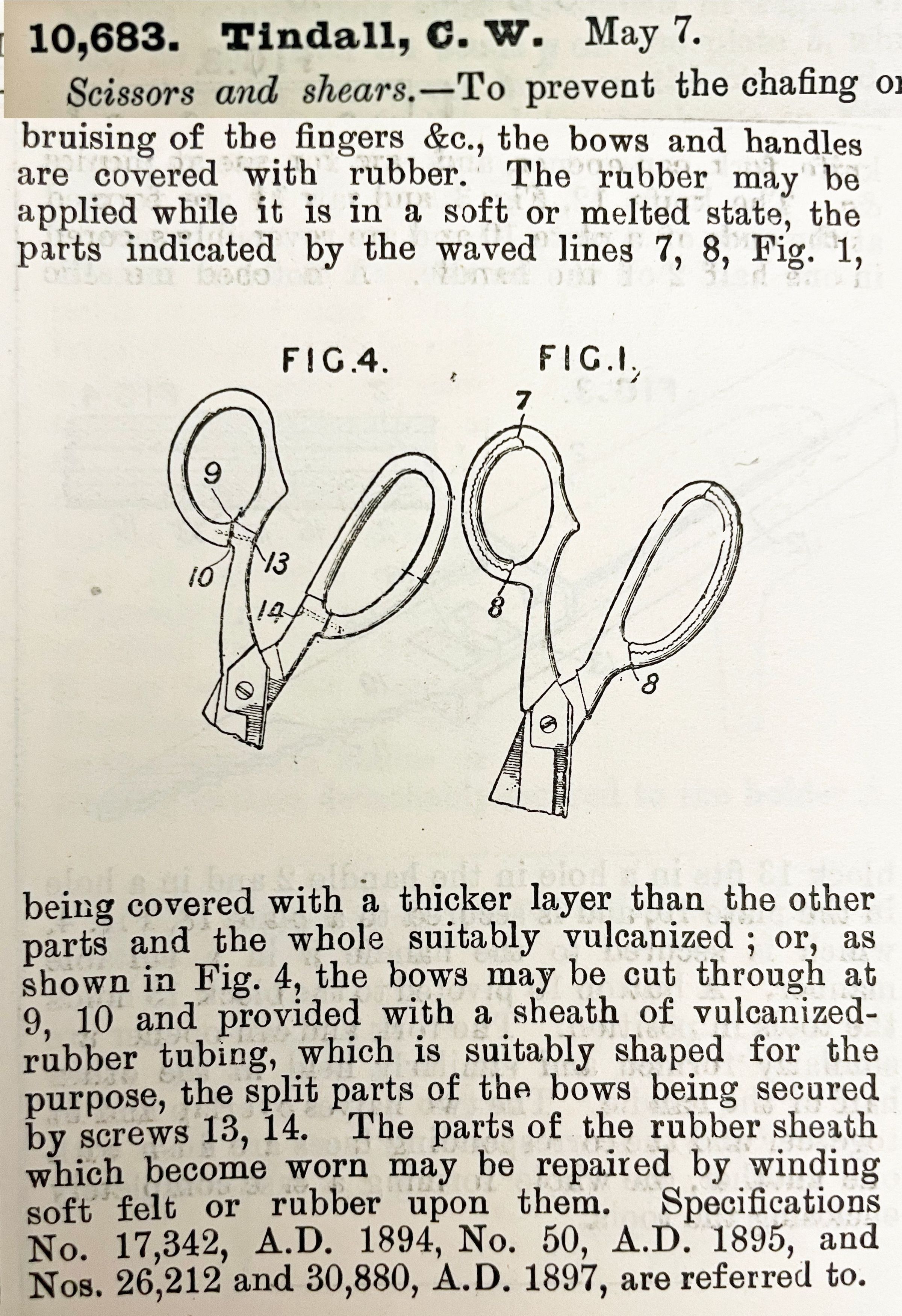 Scissors and shears. -- To prevent the chafing or bruising of the fingers &c., the bows and handles are covered with rubber. The rubber may be applied while it is soft or melted state, the parts indicated by the waved lines 7, 8, Fig. 1, being covered with a thicker layer than the other parts and the whole suitably vulcanised; or, as shown in Fig. 4, the bows may be cut through at 9, 10 and provided with a sheath of vulcanised-rubber tubing, which is suitably shaped for the purpose, the split parts of the bows being secured by screws 13, 14. The parts of the rubber sheath which become worn may be repaired by winding soft felt or rubber upon them. Specifications No. 17,342, A.D. 1894, No. 50, A.D. 1895, and Nos. 26,212 and 30,880, A.D. 1897, are referred to.Cataloged By