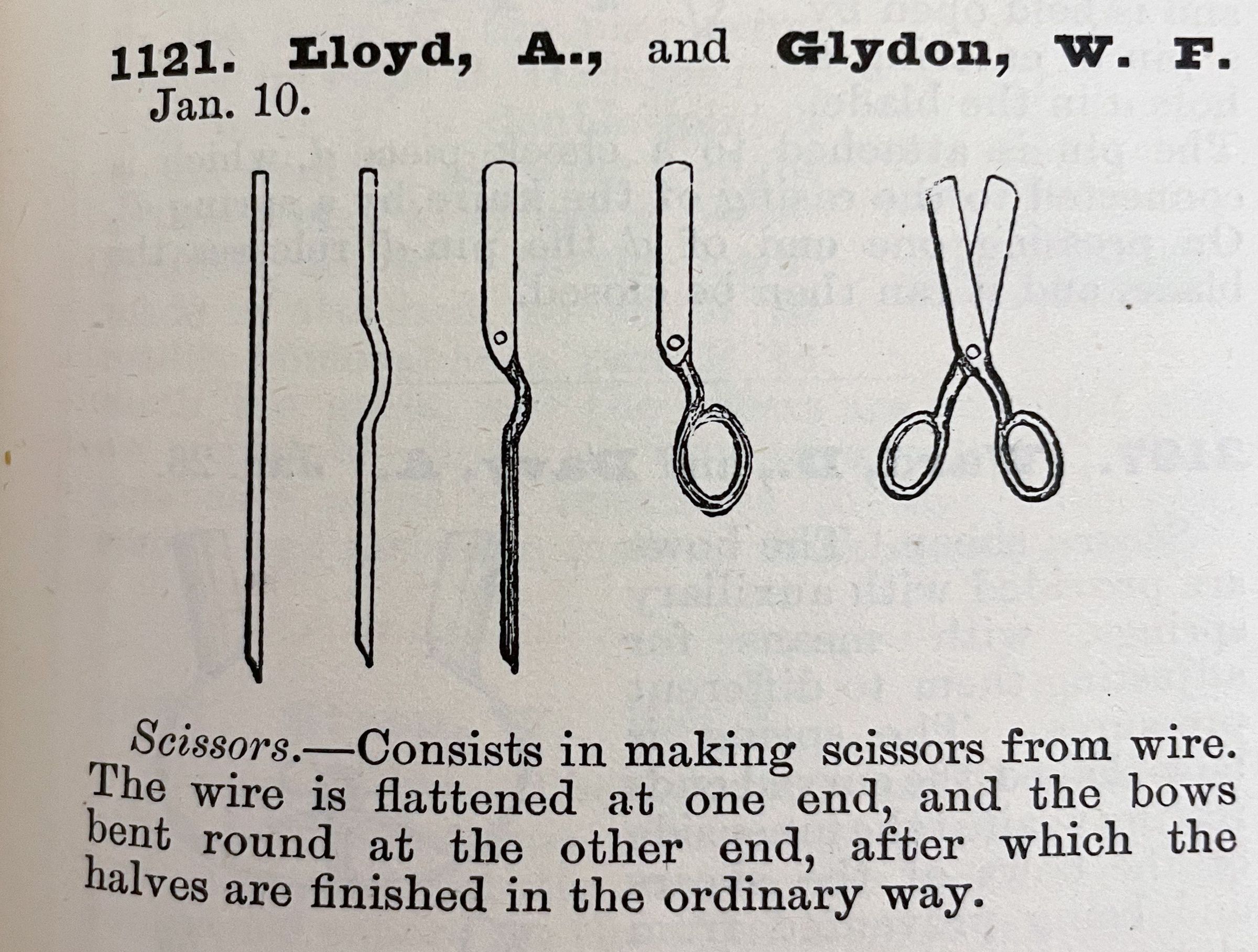 Scissors. -- Consists in making scissors from wire. The wire is flattened at one end, and the bows bent round at the other end, after which the halves are finished in the ordinary way.Cataloged By