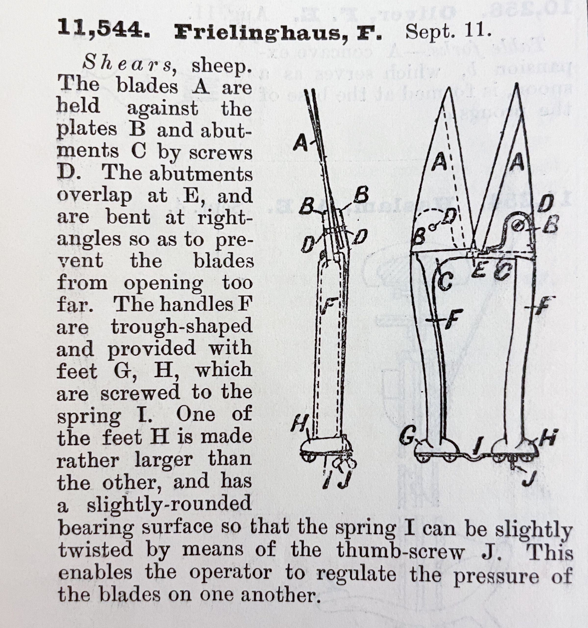 Shears, sheep. The blades A are held against the plates B and abutments C by screws D. The abutments overlap at E, and are bent at right-angles so as to prevent the blades from opening too far. The handles F are trough-shaped and provided with feet G, H, which are screwed to the spring I. One of the feet H is made rather larger than the other, and has a slightly-rounded bearing surface so that the spring I can be slightly twisted by means of the thumb-screw J. This enables the operator to regulate the pressure of the blades on one another.Cataloged By